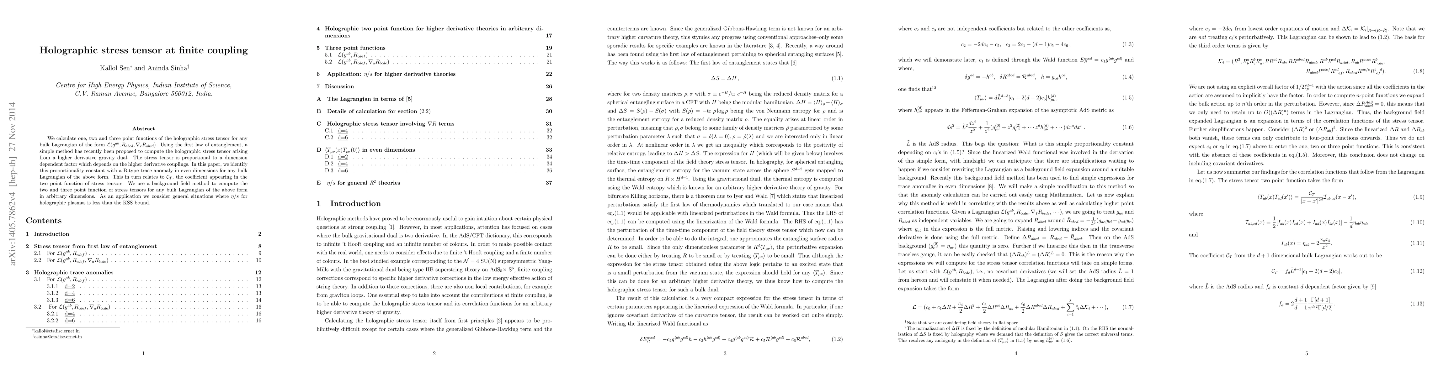 We calculate one, two and three point functions of the holographic stress tensor for any bulk Lagrangian of the form ${\mathcal{L}}(g^{ab}, R_{abcd}, \nabla_e R_{abcd})$. Using the first law of entanglement, a simple method has recently been proposed to compute the holographic stress tensor arising from a higher derivative gravity dual. The stress tensor is proportional to a dimension dependent factor which depends on the higher derivative couplings. In this paper, we identify this proportionality constant with a B-type trace anomaly in even dimensions for any bulk Lagrangian of the above form. This in turn relates to ${\mathcal{C}}_T$, the coefficient appearing in the two point function of stress tensors. We use a background field method to compute the two and three point function of stress tensors for any bulk Lagrangian of the above form in arbitrary dimensions. As an application we consider general situations where $\eta/s$ for holographic plasmas is less than the KSS bound.