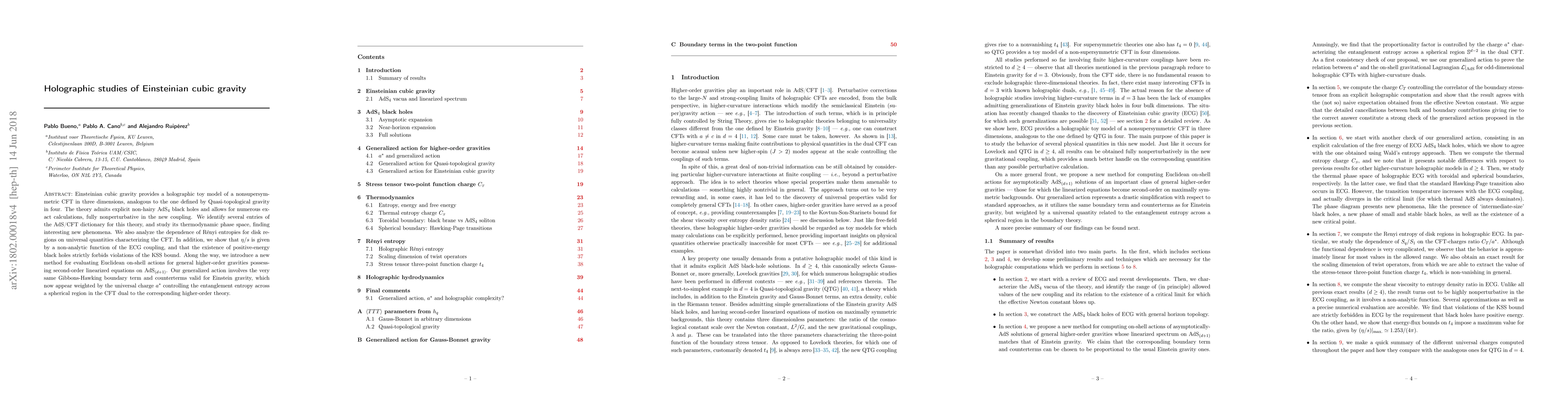 Einsteinian cubic gravity provides a holographic toy model of a nonsupersymmetric CFT in three dimensions, analogous to the one defined by Quasi-topological gravity in four. The theory admits explicit non-hairy AdS$_4$ black holes and allows for numerous exact calculations, fully nonperturbative in the new coupling. We identify several entries of the AdS/CFT dictionary for this theory, and study its thermodynamic phase space, finding interesting new phenomena. We also analyze the dependence of R\'enyi entropies for disk regions on universal quantities characterizing the CFT. In addition, we show that $\eta/s$ is given by a non-analytic function of the ECG coupling, and that the existence of positive-energy black holes strictly forbids violations of the KSS bound. Along the way, we introduce a new method for evaluating Euclidean on-shell actions for general higher-order gravities possessing second-order linearized equations on AdS$_{(d+1)}$. Our generalized action involves the very same Gibbons-Hawking boundary term and counterterms valid for Einstein gravity, which now appear weighted by the universal charge $a^*$ controlling the entanglement entropy across a spherical region in the CFT dual to the corresponding higher-order theory.