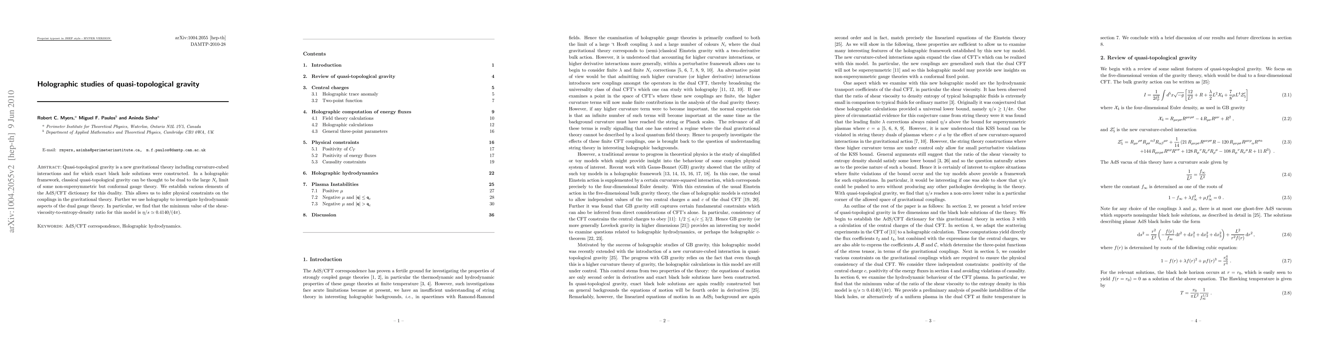 This paper explores the holographic duality of quasi-topological gravity, establishing elements of the AdS/CFT correspondence and inferring physical constraints on the gravitational theory's couplings. It also investigates hydrodynamic properties of the dual gauge theory, finding the minimum shear-viscosity-to-entropy-density ratio to be $\eta/s \simeq 0.4140/(4\pi)$.