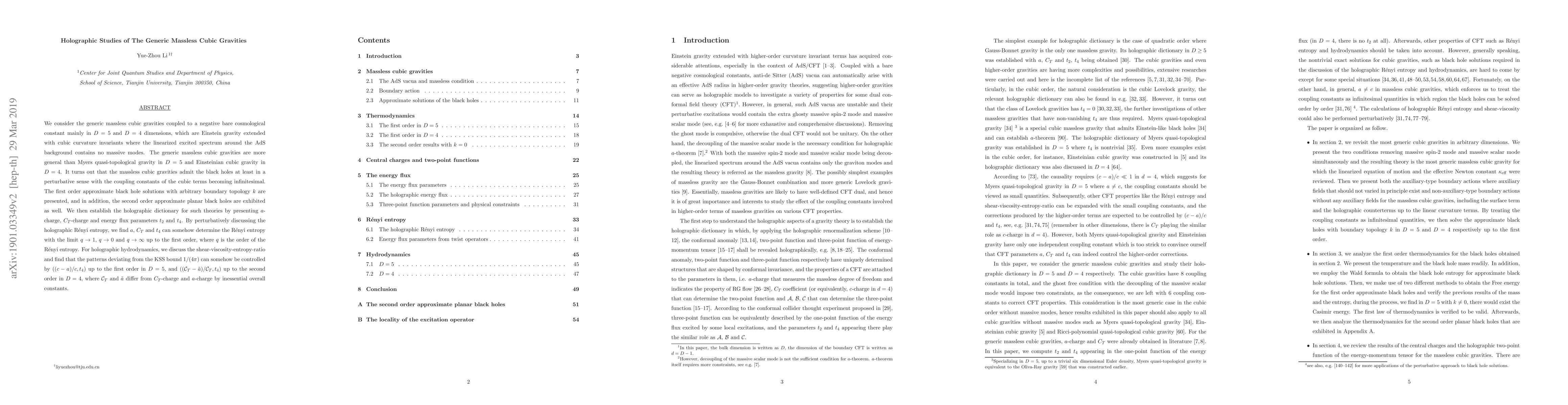 We consider the generic massless cubic gravities coupled to a negative bare cosmological constant mainly in $D=5$ and $D=4$ dimensions, which are Einstein gravity extended with cubic curvature invariants where the linearized excited spectrum around the AdS background contains no massive modes. The generic massless cubic gravities are more general than Myers quasi-topological gravity in $D=5$ and Einsteinian cubic gravity in $D=4$. It turns out that the massless cubic gravities admit the black holes at least in a perturbative sense with the coupling constants of the cubic terms becoming infinitesimal. The first order approximate black hole solutions with arbitrary boundary topology $k$ are presented, and in addition, the second order approximate planar black holes are exhibited as well. We then establish the holographic dictionary for such theories by presenting $a$-charge, $C_T$-charge and energy flux parameters $t_2$ and $t_4$. By perturbatively discussing the holographic R\'enyi entropy, we find $a$, $C_T$ and $t_4$ can somehow determine the R\'enyi entropy with the limit $q\rightarrow 1$, $q\rightarrow 0$ and $q\rightarrow \infty$ up to the first order, where $q$ is the order of the R\'enyi entropy. For holographic hydrodynamics, we discuss the shear-viscosity-entropy-ratio and find that the patterns deviating from the KSS bound $1/(4\pi)$ can somehow be controlled by $((c-a)/c,t_4)$ up to the first order in $D=5$, and $((\mathcal{C}_T-\tilde{a})/\mathcal{C}_T,t_4)$ up to the second order in $D=4$, where $\mathcal{C}_T$ and $\tilde{a}$ differ from $C_T$-charge and $a$-charge by inessential overall constants.