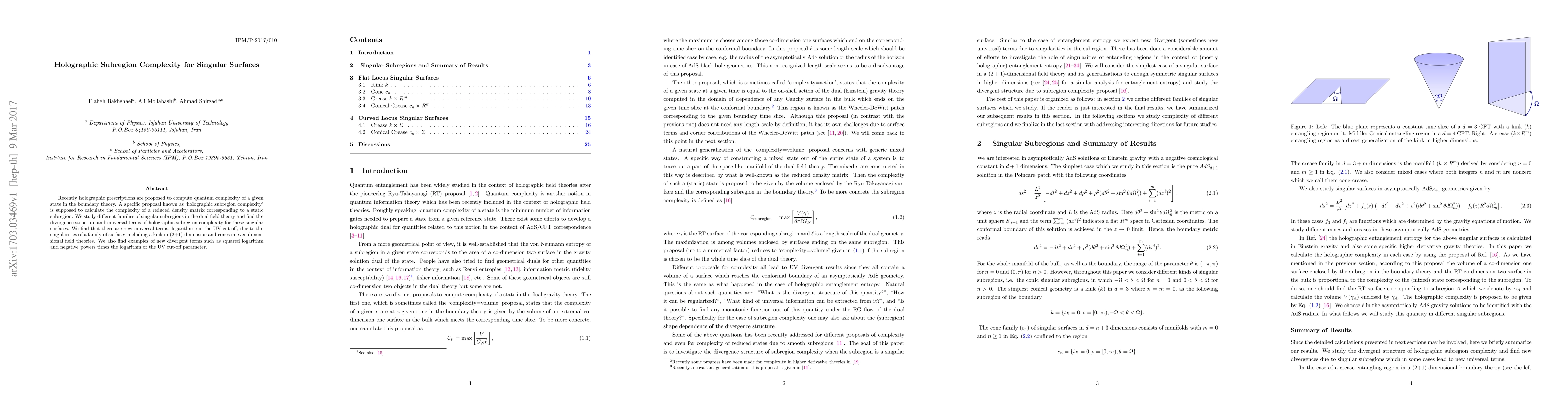 This research explores holographic subregion complexity for singular surfaces, identifying universal logarithmic terms and new divergent structures, including square logarithms and negative powers multiplied by the logarithm of the UV cutoff, arising from singularities like kinks in (2+1) dimensions and cones in even-dimensional field theories.