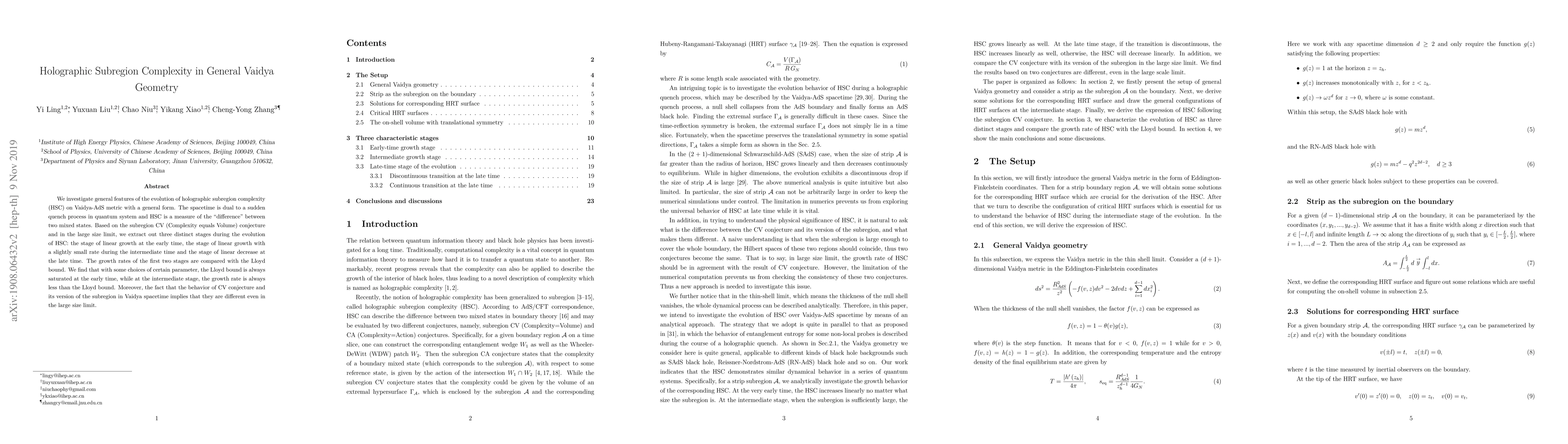 This paper explores the evolution of holographic subregion complexity in Vaidya-AdS spacetime, revealing three distinct stages: linear growth initially, followed by a slower linear growth, and finally a linear decrease. The study compares these growth rates to the Lloyd bound, showing that the bound is saturated early but surpassed later, and highlights differences in the CV conjecture's behavior in Vaidya spacetime.