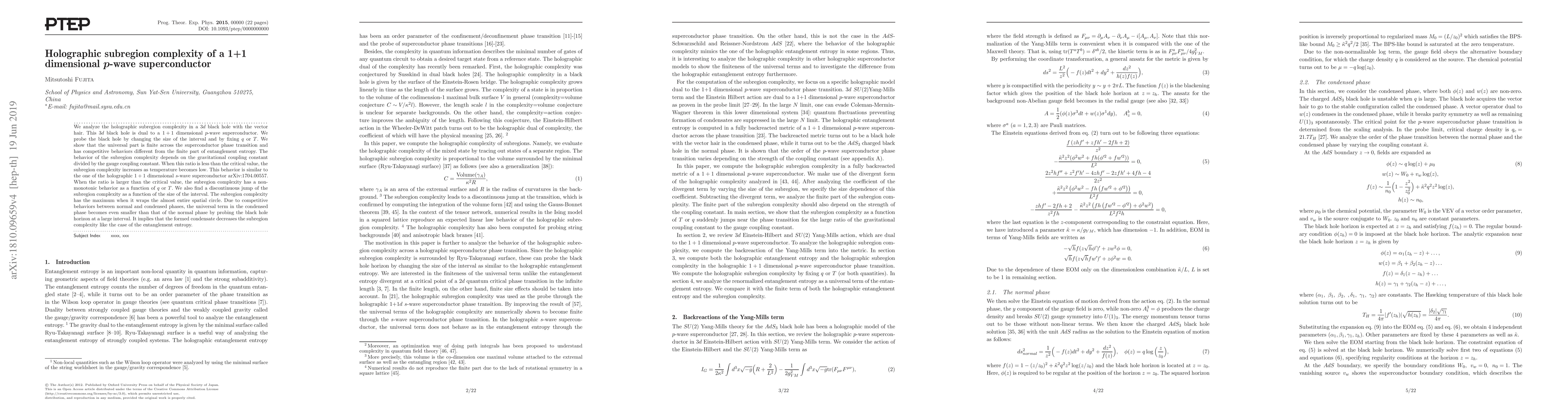 This paper explores holographic subregion complexity in a 3D black hole dual to a 1+1 dimensional p-wave superconductor, revealing finite universal behavior across phase transitions and differing behaviors from entanglement entropy. The complexity's behavior varies with gravitational to gauge coupling ratios, showing non-monotonic trends and discontinuous jumps based on interval size.