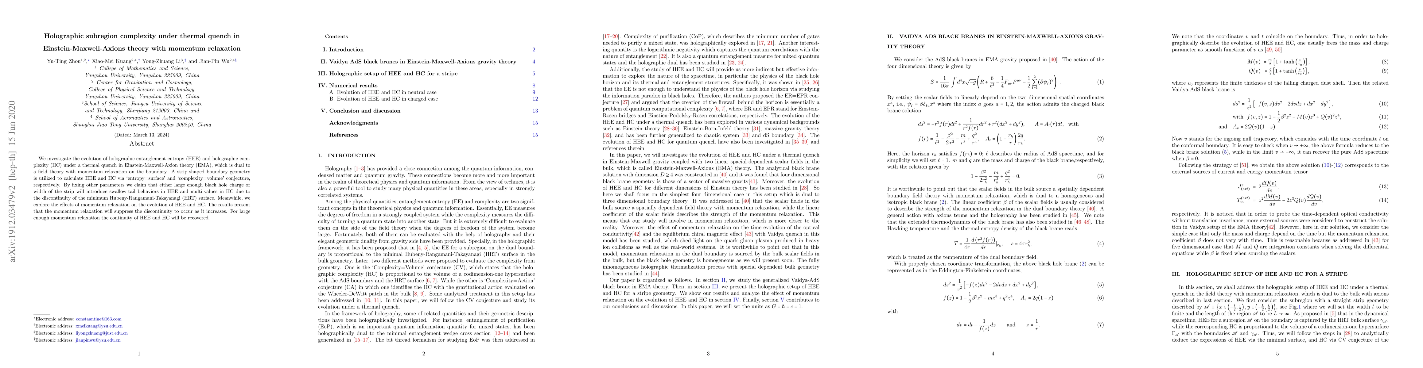 This paper examines the evolution of holographic entanglement entropy and holographic complexity in Einstein-Maxwell-Axion theory under thermal quench, finding that large black hole charge or strip width can cause discontinuities in these measures. Momentum relaxation is shown to suppress these discontinuities, restoring continuity at high relaxation levels.