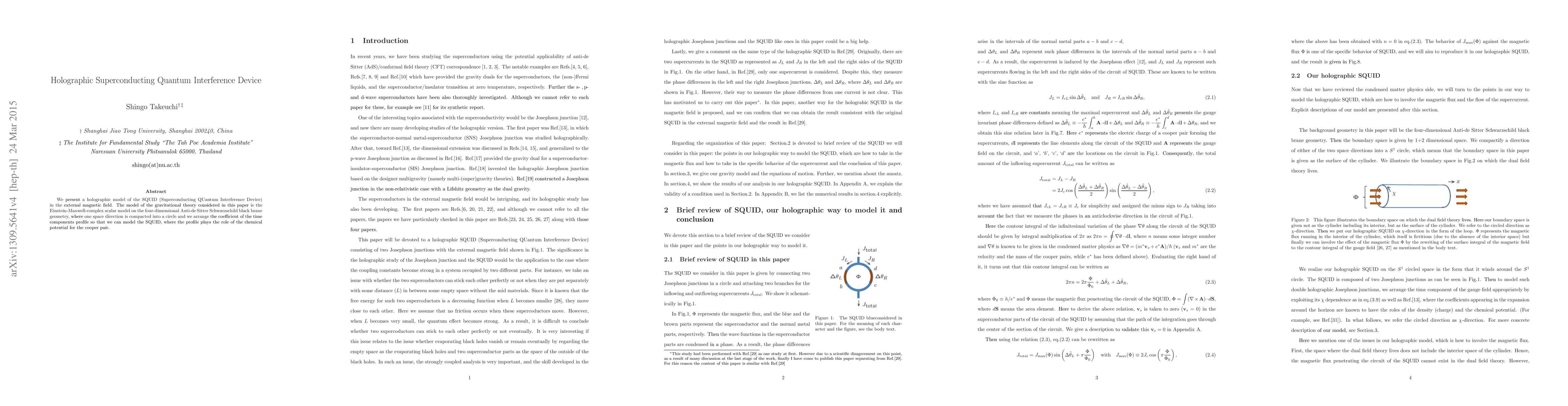 This paper develops a holographic model of a SQUID using the Einstein-Maxwell-complex scalar theory on a four-dimensional Anti-de Sitter Schwarzschild black brane geometry, where the time profile mimics the chemical potential for Cooper pairs, simulating the device's behavior in an external magnetic field.