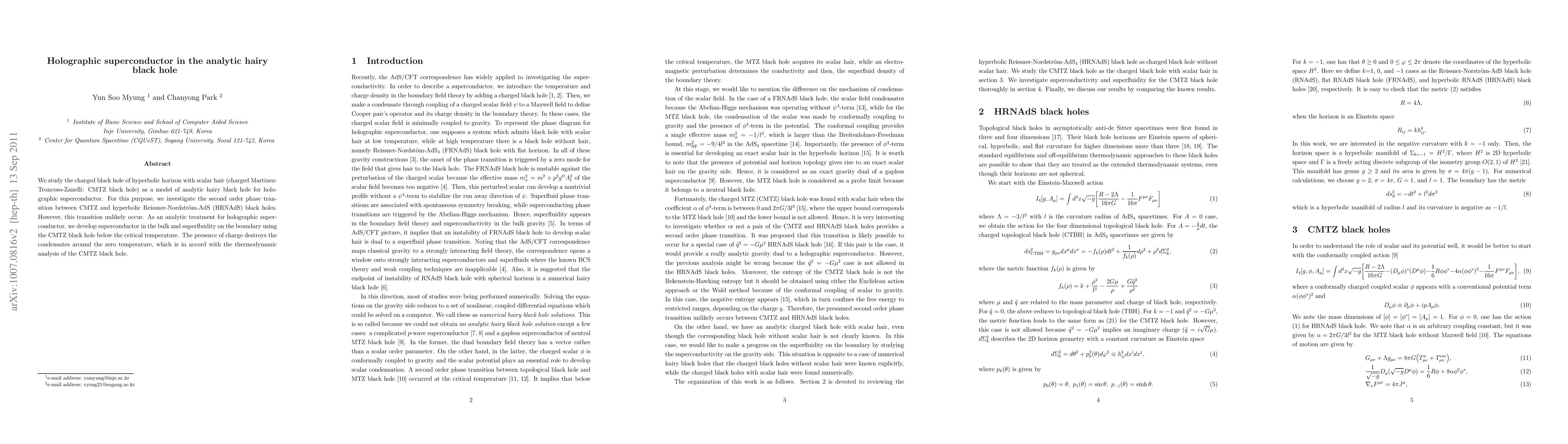 We study the charged black hole of hyperbolic horizon with scalar hair (charged Martinez-Troncoso-Zanelli: CMTZ black hole) as a model of analytic hairy black hole for holographic superconductor. For this purpose, we investigate the second order phase transition between CMTZ and hyperbolic Reissner-Nordstr\"om-AdS (HRNAdS) black holes. However, this transition unlikely occur. As an analytic treatment for holographic superconductor, we develop superconductor in the bulk and superfluidity on the boundary using the CMTZ black hole below the critical temperature. The presence of charge destroys the condensates around the zero temperature, which is in accord with the thermodynamic analysis of the CMTZ black hole.