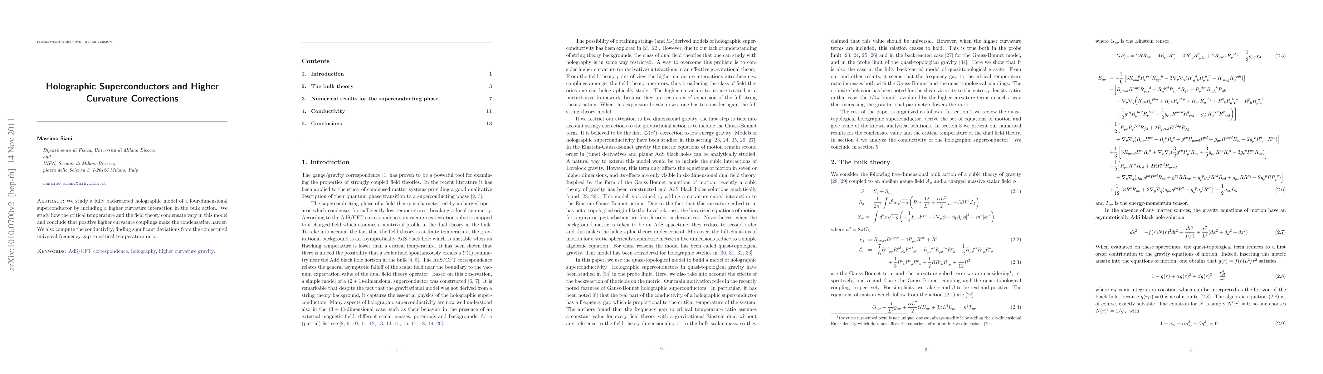 This paper investigates a four-dimensional holographic superconductor model with higher curvature corrections, finding that positive higher curvature couplings reduce the critical temperature and alter the field theory condensate. The study also reveals significant deviations in the conductivity's frequency gap to critical temperature ratio.