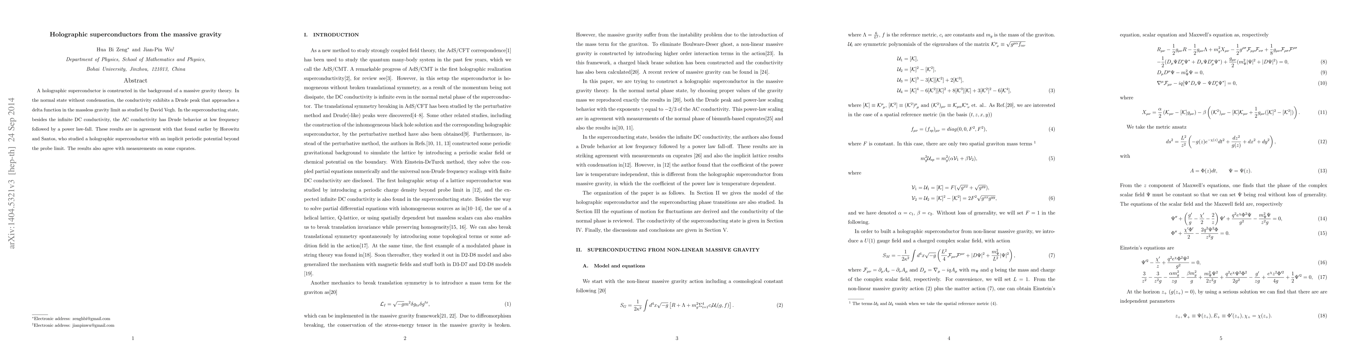 A holographic superconductor is constructed in the background of a massive gravity theory. In the normal state without condensation, the conductivity exhibits a Drude peak that approaches a delta function in the massless gravity limit as studied by David Vegh. In the superconducting state, besides the infinite DC conductivity, the AC conductivity has Drude behavior at low frequency followed by a power law-fall. These results are in agreement with that found earlier by Horowitz and Santos, who studied a holographic superconductor with an implicit periodic potential beyond the probe limit. The results also agree with measurements on some cuprates.