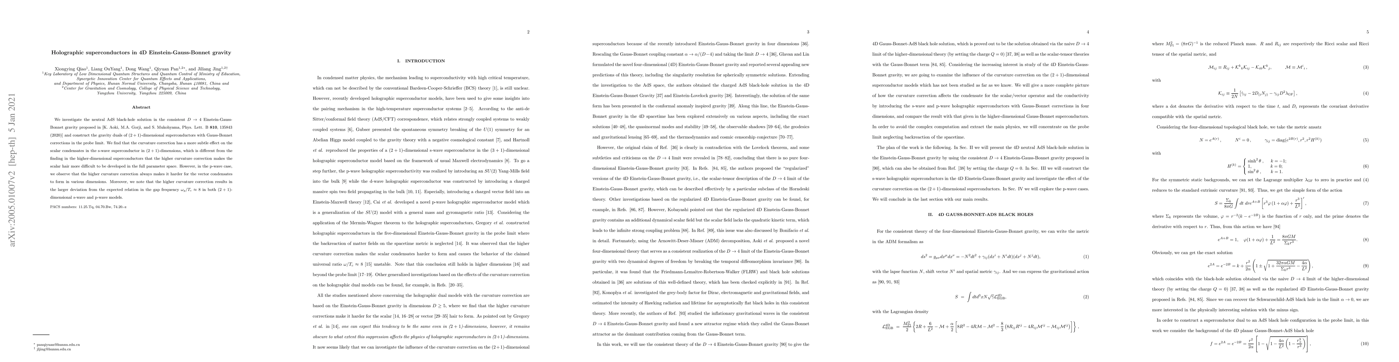 This study explores neutral AdS black holes in 4D Einstein-Gauss-Bonnet gravity, constructing gravity duals for ($2+1$)-dimensional superconductors with Gauss-Bonnet corrections. It finds that while curvature corrections affect s-wave and p-wave superconductors differently, they consistently increase the difficulty of vector condensate formation and deviate from the standard gap frequency relation.