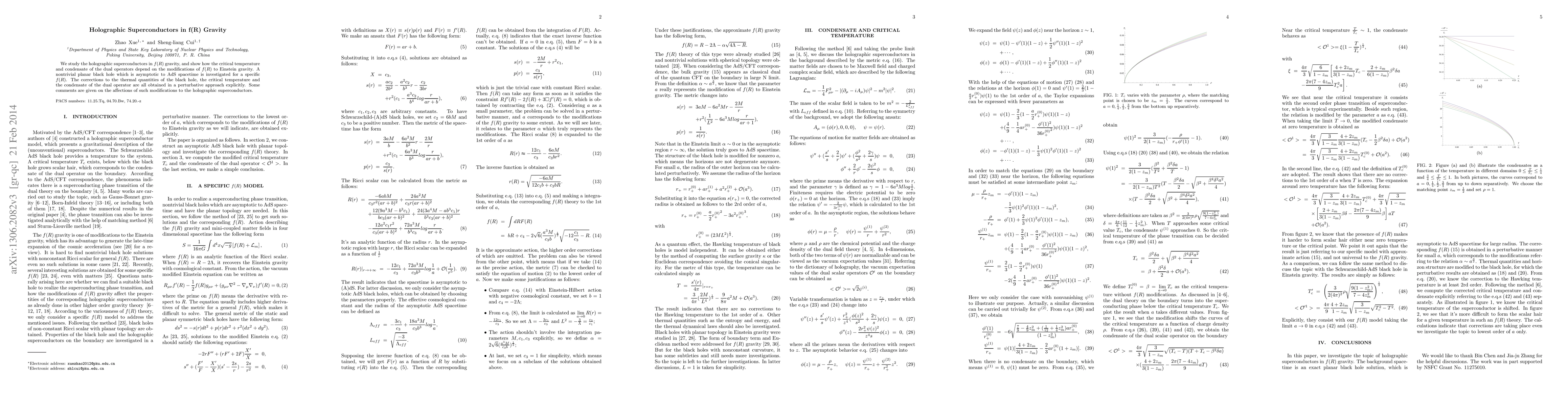 This paper investigates holographic superconductors within the framework of f(R) gravity, demonstrating how modifications to Einstein gravity affect the critical temperature and condensate of the dual operator. It employs a perturbative approach to derive corrections to the thermal dynamics of black holes in f(R) gravity, specifically focusing on a planar black hole solution asymptotic to AdS spacetime.