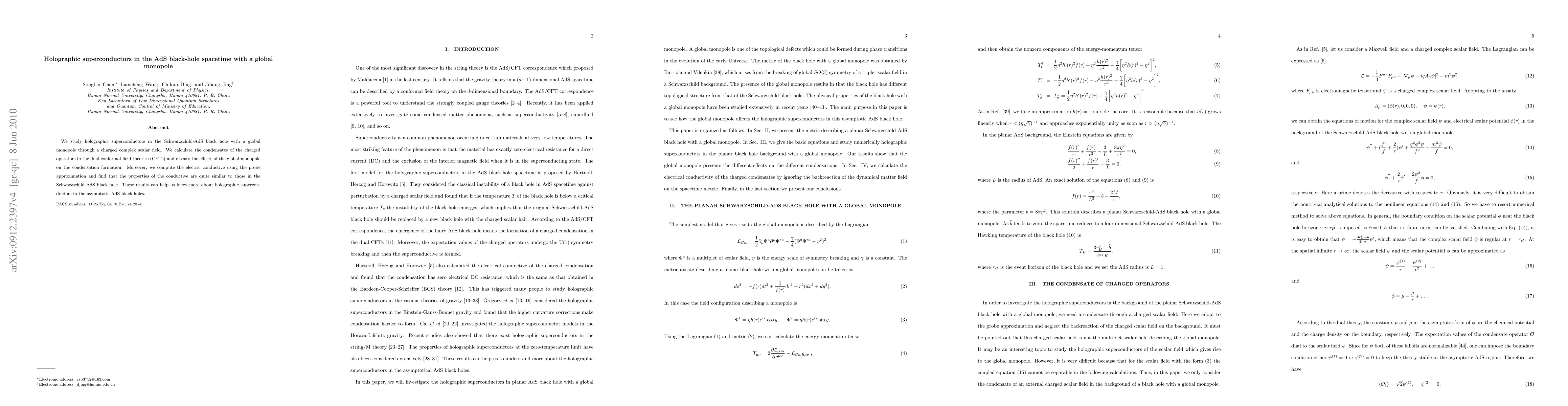 This research examines holographic superconductors in the context of a Schwarzschild-AdS black hole with a global monopole, focusing on a charged complex scalar field. It finds that the global monopole influences condensate formation and conductive properties, which closely resemble those in standard Schwarzschild-AdS black holes.