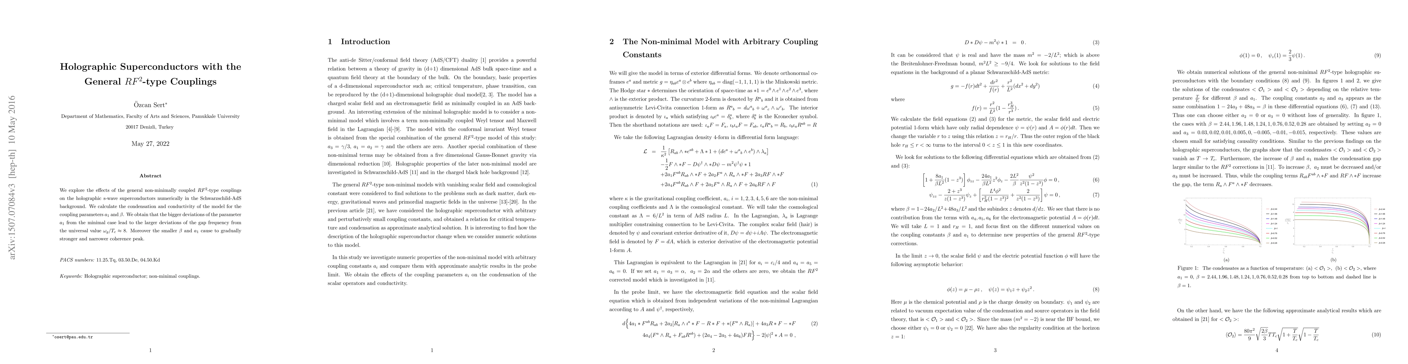 We explore the effects of the general non-minimally coupled $RF^2$-type couplings on the holographic s-wave superconductors numerically in the Schwarzschild-AdS background. We calculate the condensation and conductivity of the model for the coupling parameters $a_1$ and $\beta$. We obtain that the bigger deviations of the parameter $a_1$ from the minimal case lead to the larger deviations of the gap frequency from the universal value $\omega_g/T_c \approx 8$. Moreover the smaller $\beta $ and $a_1$ cause to gradually stronger and narrower coherence peak.