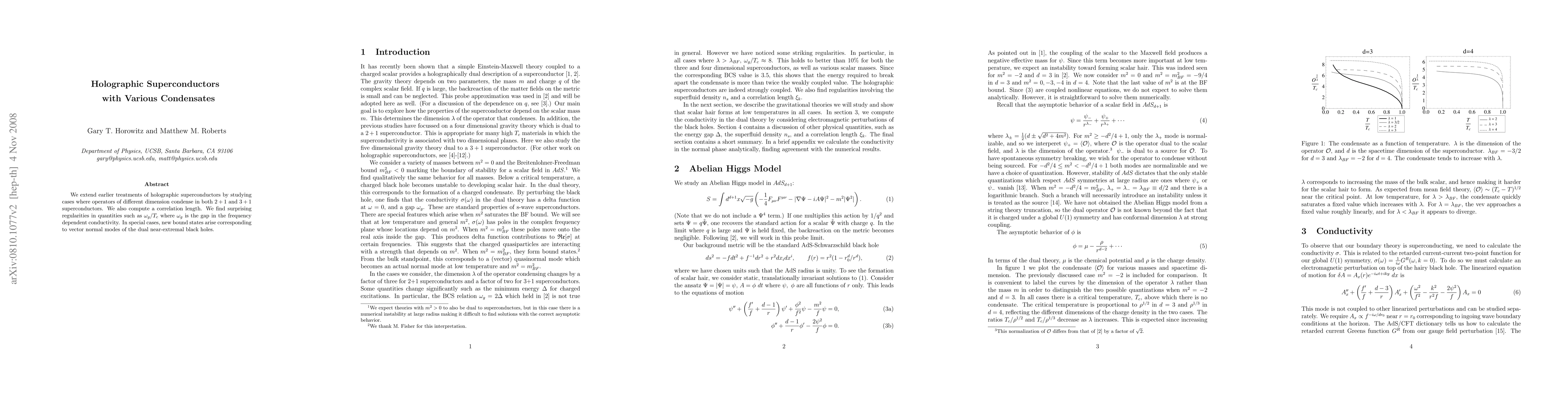We extend earlier treatments of holographic superconductors by studying cases where operators of different dimension condense in both 2+1 and 3+1 superconductors. We also compute a correlation length. We find surprising regularities in quantities such as $\omega_g/T_c$ where $\omega_g$ is the gap in the frequency dependent conductivity. In special cases, new bound states arise corresponding to vector normal modes of the dual near-extremal black holes.