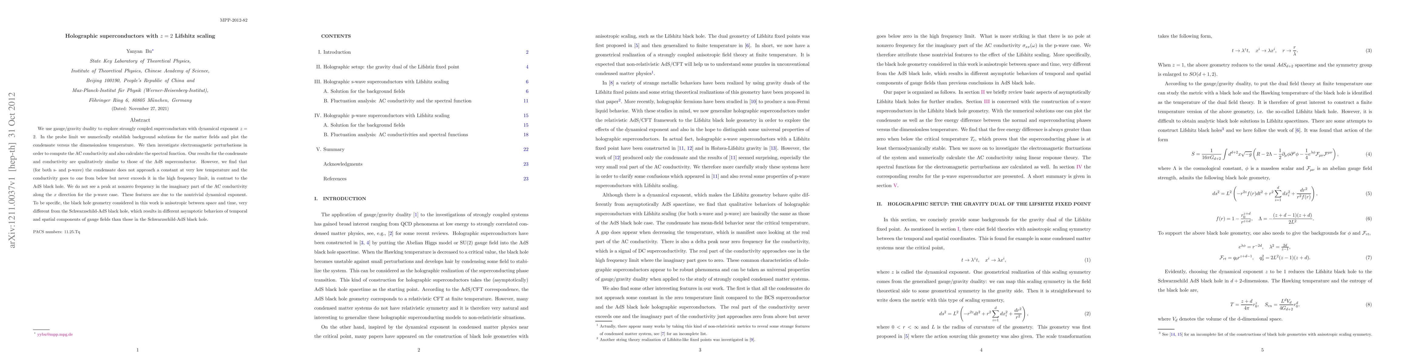 We use gauge/gravity duality to explore strongly coupled superconductors with dynamical exponent $z=2$. In the probe limit we numerically establish background solutions for the matter fields and plot the condensate versus the dimensionless temperature. We then investigate electromagnetic perturbations in order to compute the AC conductivity and also calculate the spectral function. Our results for the condensate and conductivity are qualitatively similar to those of the AdS superconductor. However, we find that (for both s- and p-wave) the condensate does not approach a constant at very low temperature and the conductivity goes to one from below but never exceeds it in the high frequency limit, in contrast to the AdS black hole. We do not see a peak at nonzero frequency in the imaginary part of the AC conductivity along the $x$ direction for the p-wave case. These features are due to the nontrivial dynamical exponent. To be specific, the black hole geometry considered in this work is anisotropic between space and time, very different from the Schwarzschild-AdS black hole, which results in different asymptotic behaviors of temporal and spatial components of gauge fields than those in the Schwarzschild-AdS black hole.
