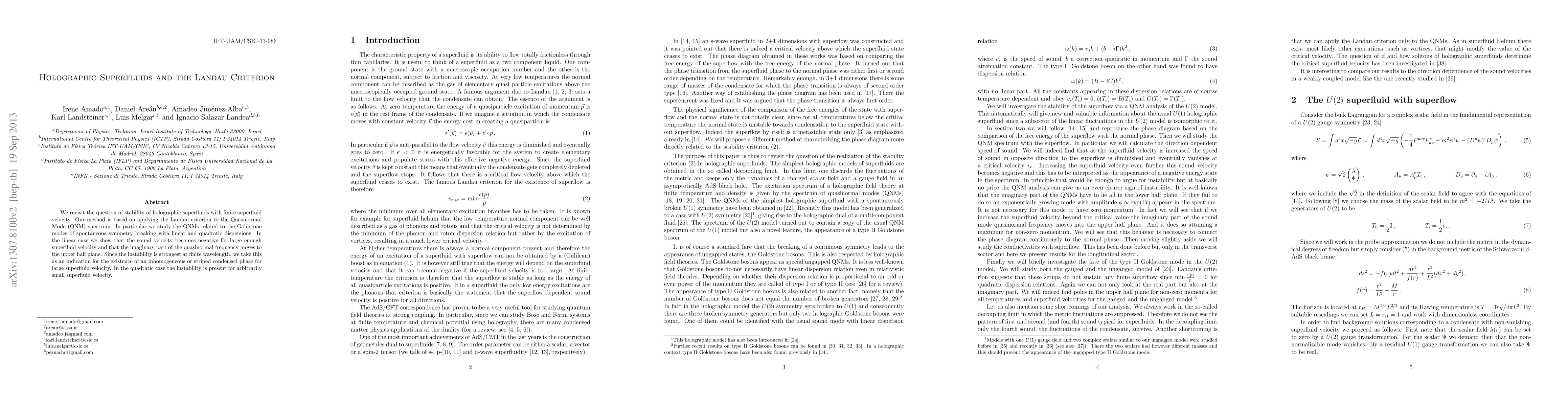 This paper examines the stability of holographic superfluids using the Landau criterion and Quasinormal Modes, finding that linear dispersions lead to negative sound velocity and instability at large superfluid velocities, suggesting a striped phase, while quadratic dispersions show instability even at small superfluid velocities.