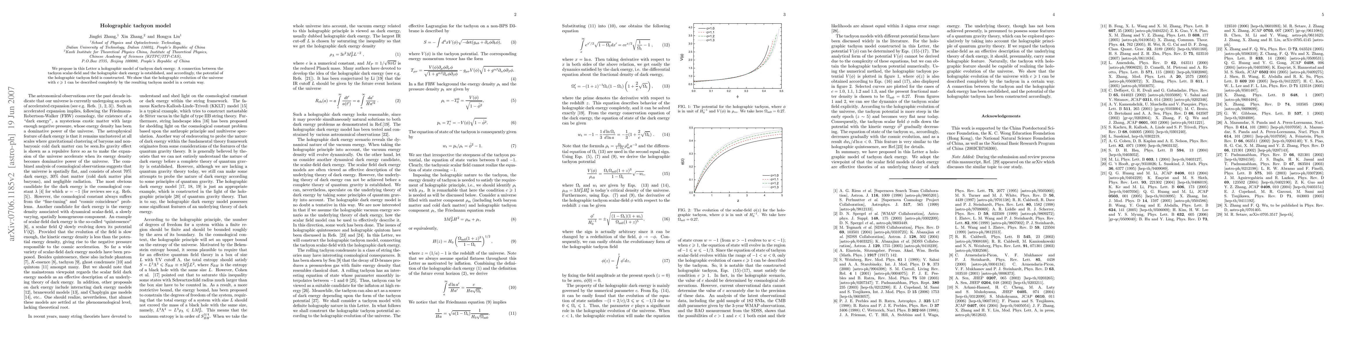 This paper proposes a holographic model linking tachyon dark energy to a scalar field, constructing its potential and demonstrating the model's ability to describe the universe's evolution under holographic principles.