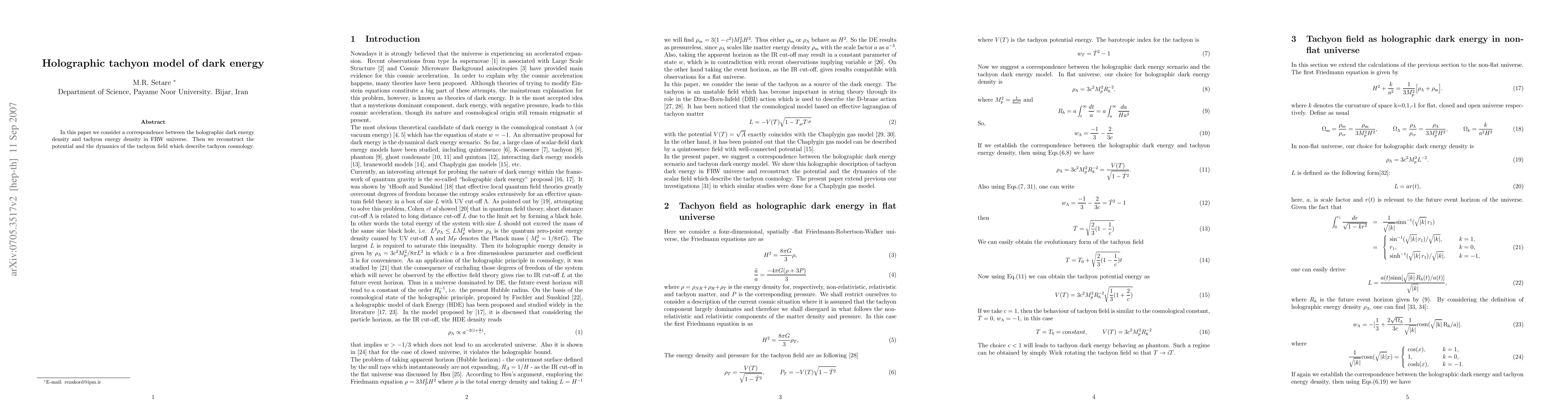 This paper explores the relationship between holographic dark energy and tachyon energy densities in a Friedmann-Robertson-Walker universe, and reconstructs the potential and dynamics of a tachyon field to describe tachyon cosmology.