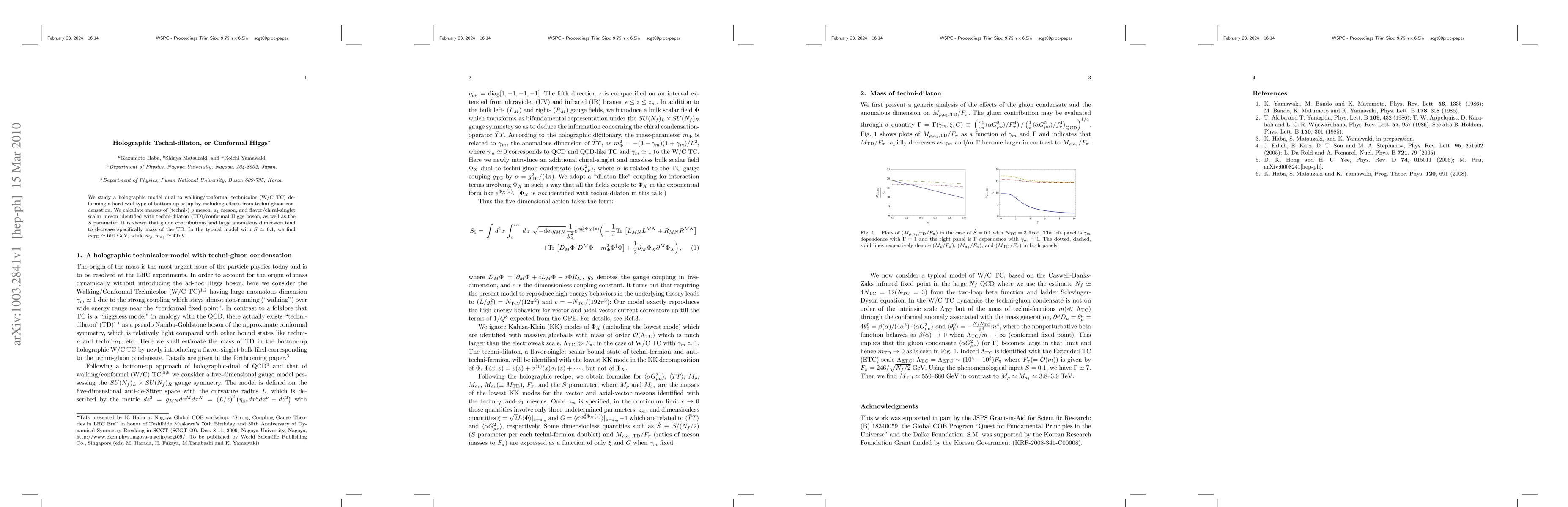 The research employs a holographic bottom-up model to study walking/conformal technicolor (W/C TC), incorporating technigluon condensation effects. It calculates masses of (techni-) ρ meson, a1 meson, and flavor/chiral-singlet scalar meson (techni-dilaton/conformal Higgs boson), along with the S parameter.
