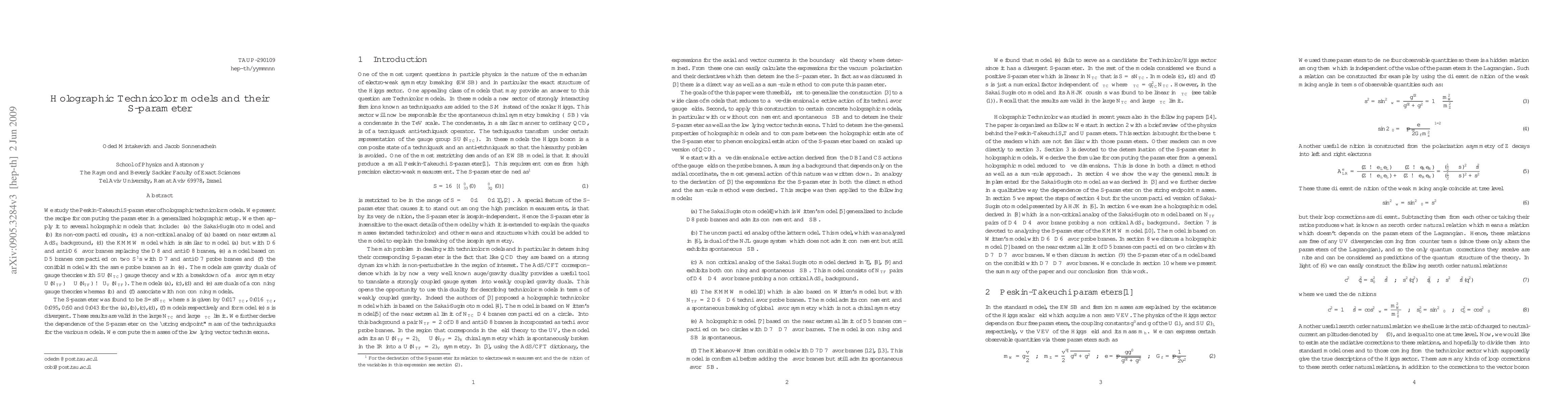 This paper investigates the Peskin-Takeuchi S-parameter in various holographic technicolor models, including the Sakai-Sugimoto model and its variants. The S-parameter is found to be proportional to the technicolor gauge coupling, with specific values for each model, and is shown to depend on the techniquark mass.