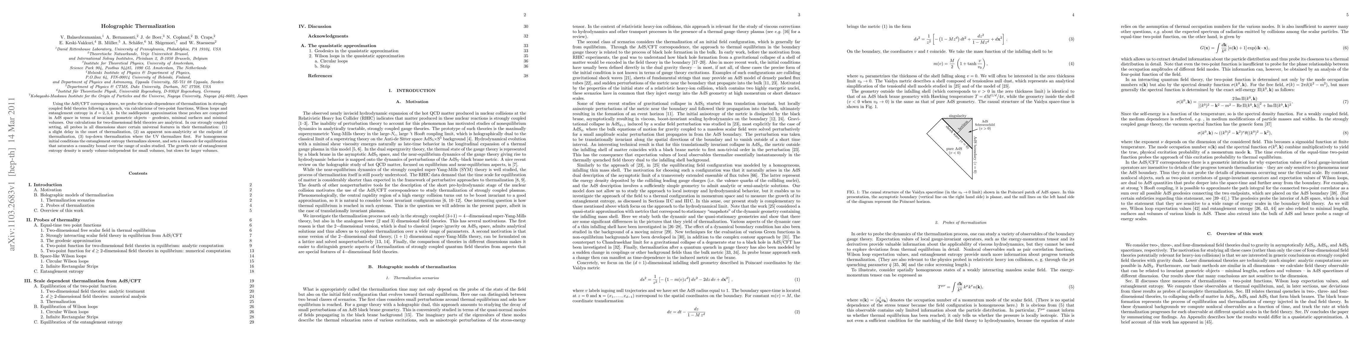 The paper presents a detailed analysis of thermalization using invariant geometric objects (geodesics, minimal surfaces, minimal volumes) in AdS space, providing a comprehensive understanding of thermalization processes in strongly coupled field theories.