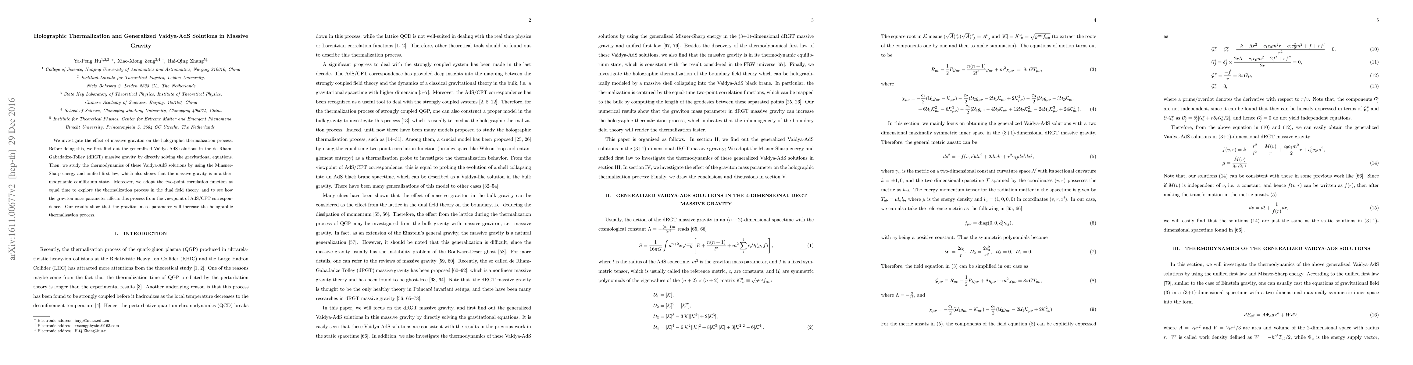 This paper explores the impact of massive gravitons on holographic thermalization within the framework of dRGT massive gravity. It derives generalized Vaidya-AdS solutions and studies their thermodynamics, showing thermodynamic equilibrium in massive gravity. The research further examines how the graviton mass parameter influences thermalization in the dual field theory via AdS/CFT correspondence, finding that it enhances the process.