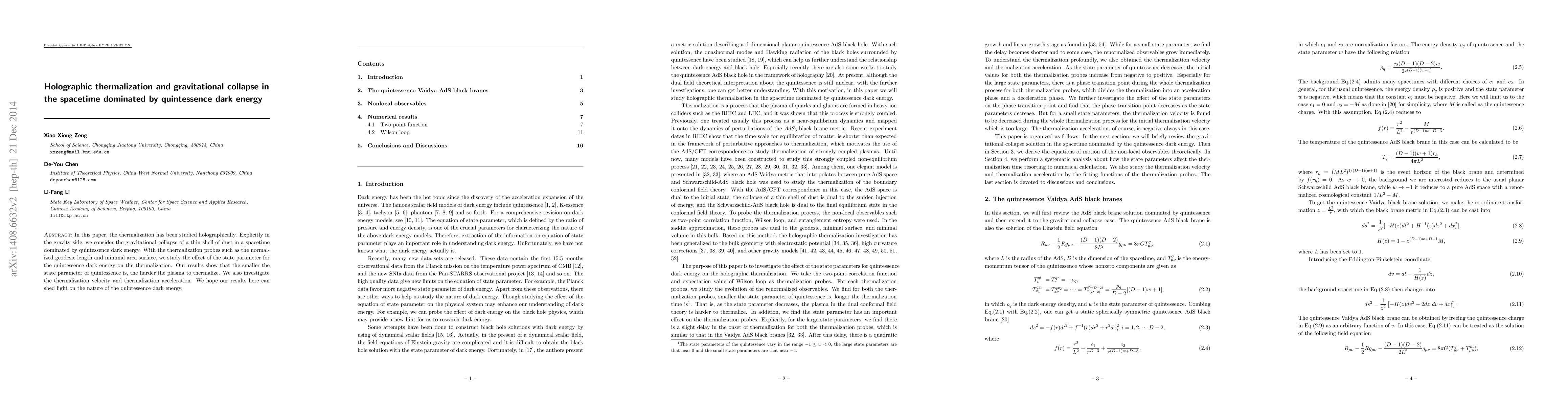 In this paper, the thermalization has been studied holographically. Explicitly in the gravity side, we consider the gravitational collapse of a thin shell of dust in a spacetime dominated by quintessence dark energy. With the thermalization probes such as the normalized geodesic length and minimal area surface, we study the effect of the state parameter for the quintessence dark energy on the thermalization. Our results show that the smaller the state parameter of quintessence is, the harder the plasma to thermalize. We also investigate the thermalization velocity and thermalization acceleration. We hope our results here can shed light on the nature of the quintessence dark energy.