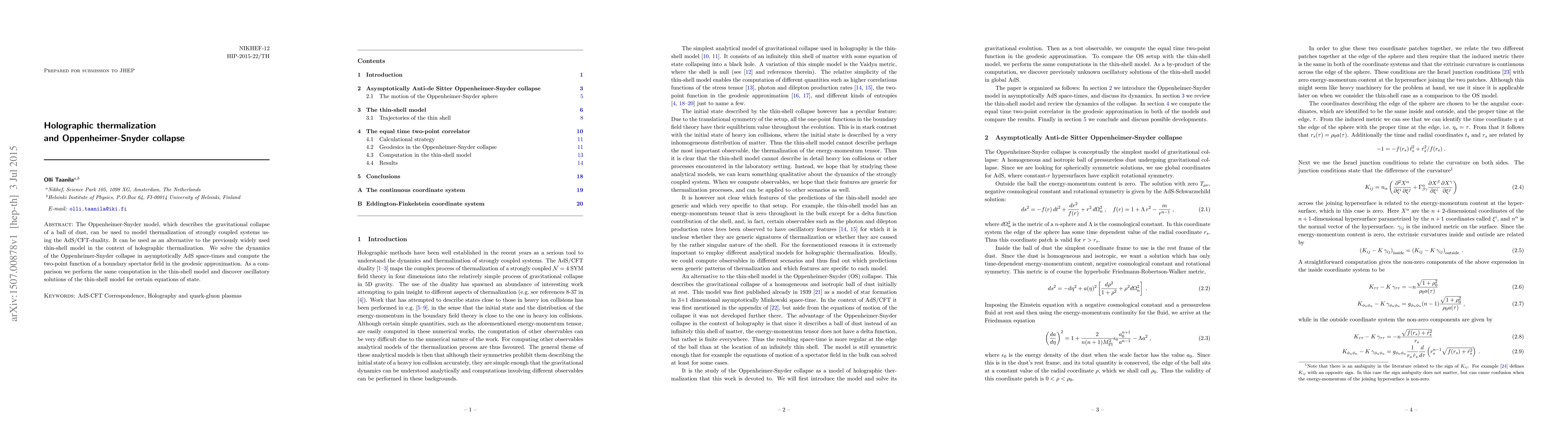 The paper explores the Oppenheimer-Snyder collapse model to study holographic thermalization, comparing it to the thin-shell model and finding oscillatory solutions in the latter for specific conditions. The AdS/CFT-duality is used to model the thermalization process in strongly coupled systems.