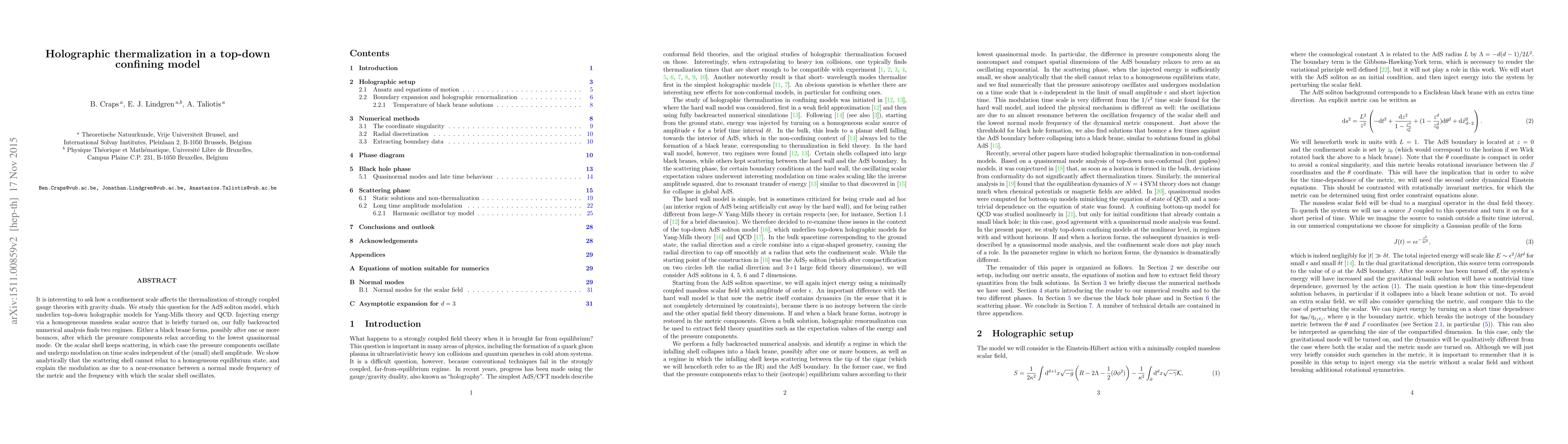 Researchers studied how energy injected into a holographic model affects its thermalization, finding two regimes: one where a black brane forms and pressure components relax, or another where the energy source continues to scatter, causing oscillating pressure.