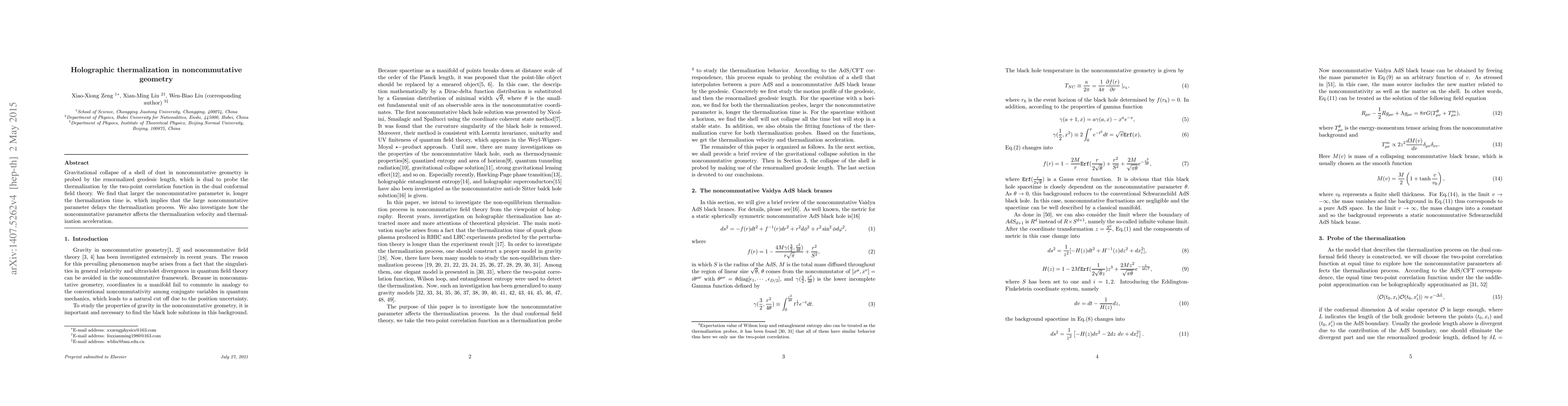 This research explores holographic thermalization in noncommutative geometry through gravitational collapse, finding that higher noncommutative parameters increase thermalization time, thus delaying the thermalization process, and also influence thermalization velocity and acceleration.