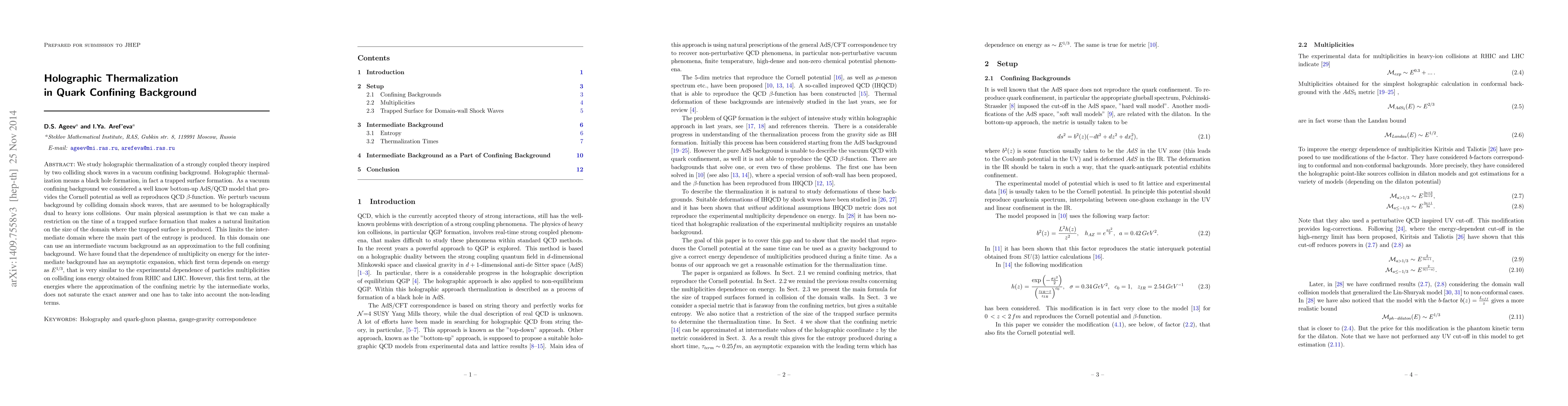 The paper presents a detailed analysis of holographic thermalization in a quark confining background, providing a method to estimate thermalization times and entropy production in heavy-ion collisions using domain shock waves in a vacuum confining background.
