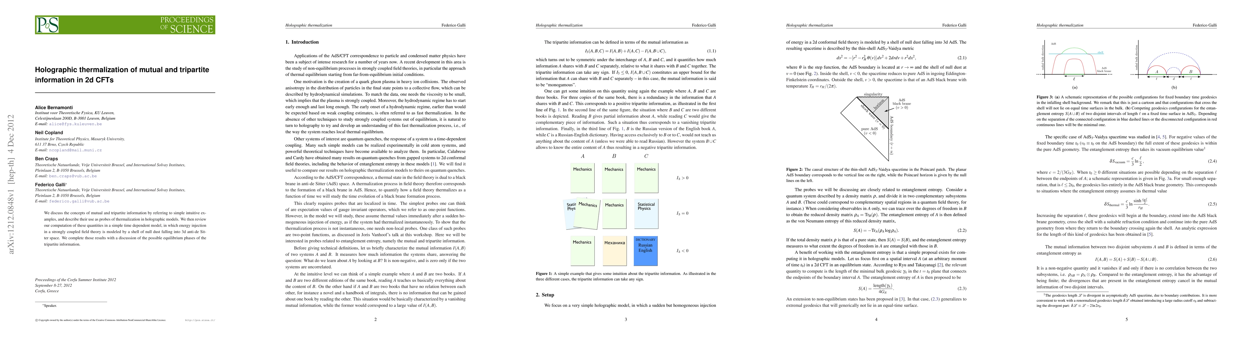 This paper explores mutual and tripartite information as indicators of thermalization in holographic models, specifically in 2D CFTs. It computes these information measures in a time-dependent model where energy injection is modeled by a shell of null dust falling into 3D AdS space, and discusses the resulting equilibrium phases of tripartite information.