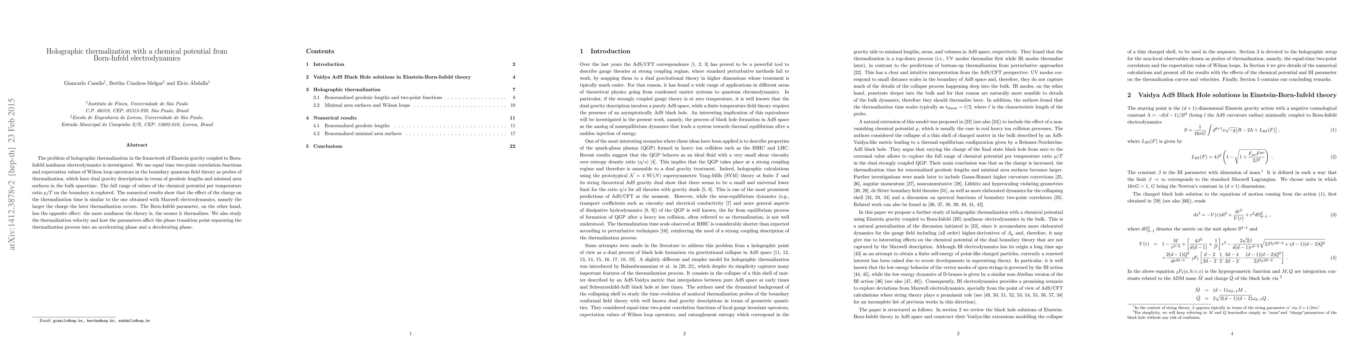 The problem of holographic thermalization in the framework of Einstein gravity coupled to Born-Infeld nonlinear electrodynamics is investigated. We use equal time two-point correlation functions and expectation values of Wilson loop operators in the boundary quantum field theory as probes of thermalization, which have dual gravity descriptions in terms of geodesic lengths and minimal area surfaces in the bulk spacetime. The full range of values of the chemical potential per temperature ratio on the boundary is explored. The numerical results show that the effect of the charge on the thermalization time is similar to the one obtained with Maxwell electrodynamics, namely the larger the charge the later thermalization occurs. The inverse Born-Infeld parameter, on the other hand, has the opposite effect: the more nonlinear the theory is, the sooner it thermalizes. We also study the thermalization velocity and how the parameters affect the phase transition point separating the thermalization process into an accelerating phase and a decelerating phase.