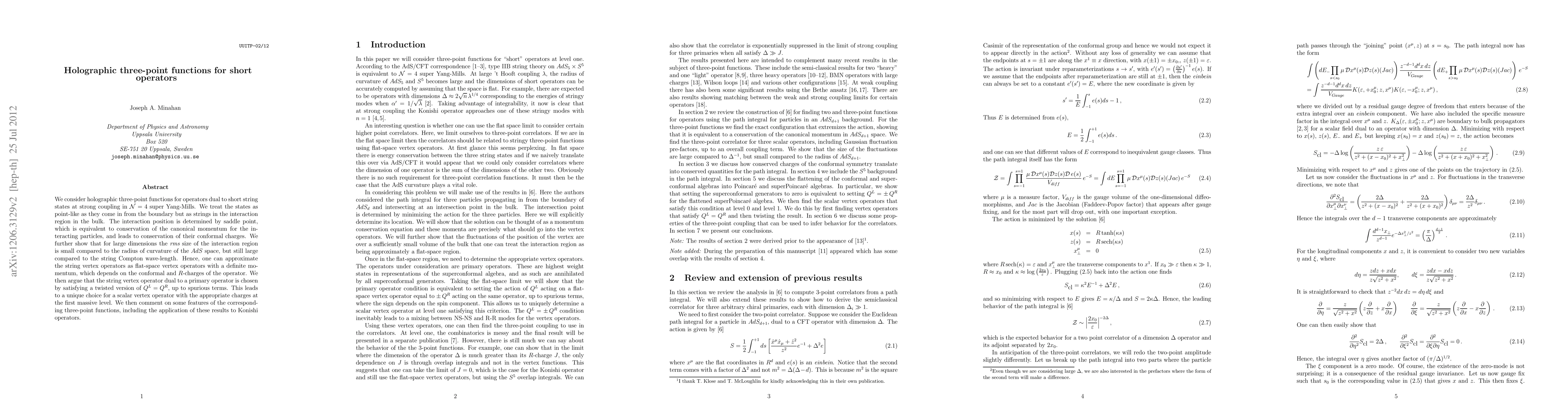 We consider holographic three-point functions for operators dual to short string states at strong coupling in N=4 super Yang-Mills. We treat the states as point-like as they come in from the boundary but as strings in the interaction region in the bulk. The interaction position is determined by saddle point, which is equivalent to conservation of the canonical momentum for the interacting particles, and leads to conservation of their conformal charges. We further show that for large dimensions the rms size of the interaction region is small compared to the radius of curvature of the AdS space, but still large compared to the string Compton wave-length. Hence, one can approximate the string vertex operators as flat-space vertex operators with a definite momentum, which depends on the conformal and R-charges of the operator. We then argue that the string vertex operator dual to a primary operator is chosen by satisfying a twisted version of Q^L=Q^R, up to spurious terms. This leads to a unique choice for a scalar vertex operator with the appropriate charges at the first massive level. We then comment on some features of the corresponding three-point functions, including the application of these results to Konishi operators.