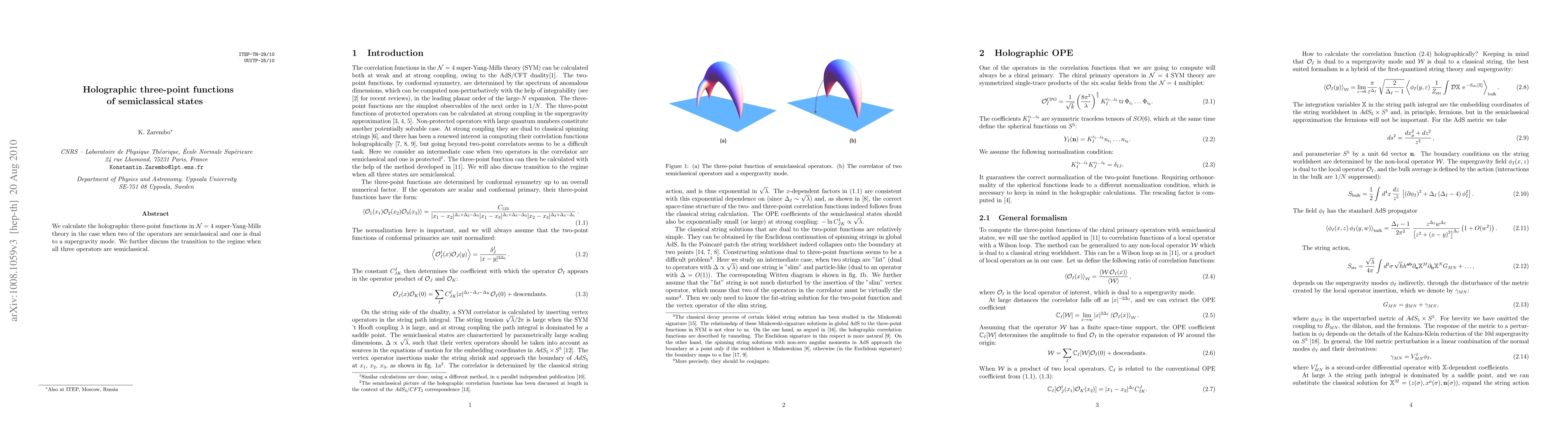 This paper calculates holographic three-point functions in N=4 super-Yang-Mills theory, focusing on scenarios where two operators are semiclassical and one is dual to a supergravity mode. It also explores the transition to a regime with all three operators being semiclassical.