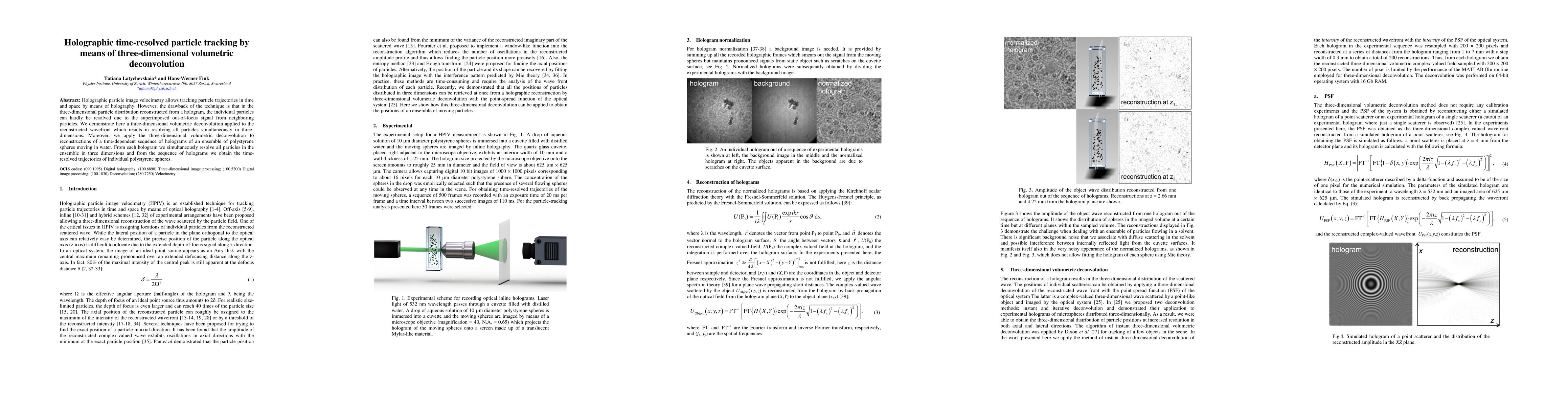 This paper presents a method for holographic time-resolved particle tracking using three-dimensional volumetric deconvolution to resolve individual particles in a three-dimensional distribution, overcoming the issue of out-of-focus signals. The technique successfully tracks the trajectories of polystyrene spheres in water from a sequence of holograms.