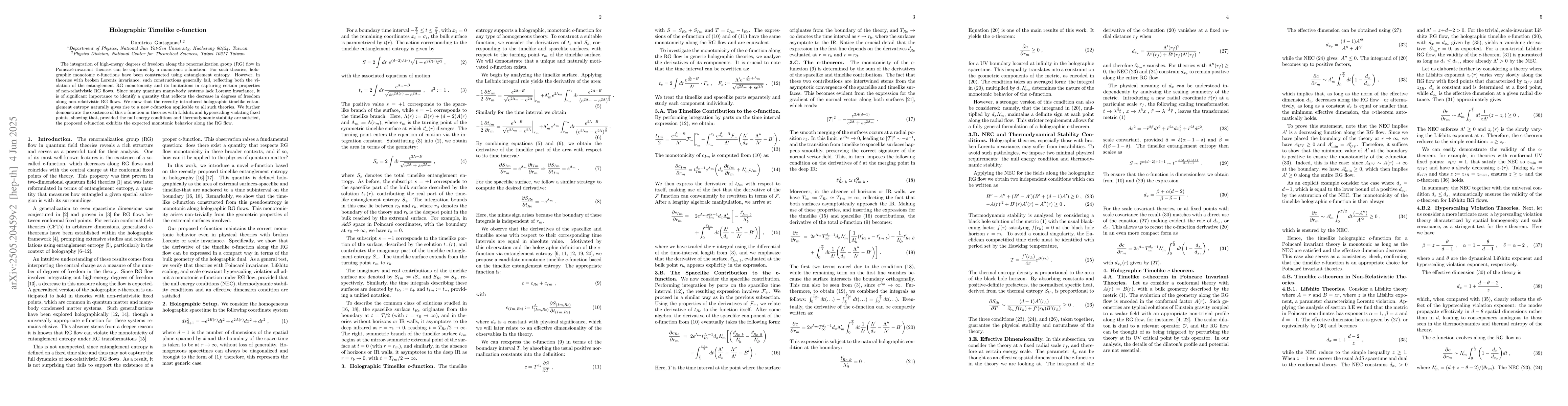 The paper introduces a novel holographic timelike c-function based on timelike entanglement entropy, extending the applicability of c-functions to non-Lorentz invariant theories.