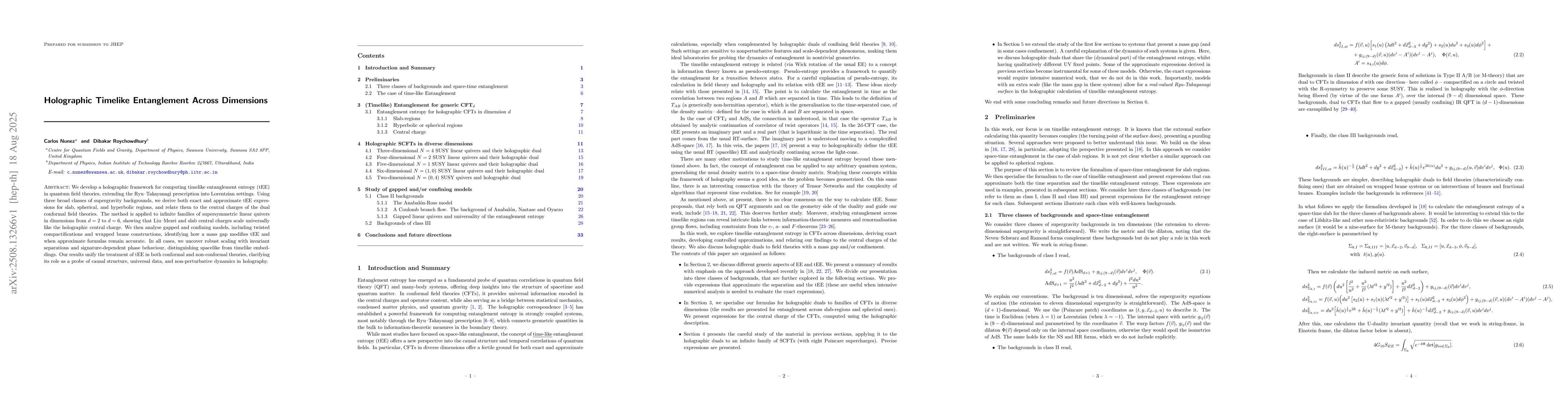 We develop a holographic framework for computing timelike entanglement entropy (tEE) in quantum field theories, extending the Ryu-Takayanagi prescription into Lorentzian settings. Using three broad classes of supergravity backgrounds, we derive both exact and approximate tEE expressions for slab, spherical, and hyperbolic regions, and relate them to the central charges of the dual conformal field theories. The method is applied to infinite families of supersymmetric linear quivers in dimensions from d=2 to d=6, showing that Liu-Mezei and slab central charges scale universally like the holographic central charge. We then analyse gapped and confining models, including twisted compactifications and wrapped brane constructions, identifying how a mass gap modifies tEE and when approximate formulas remain accurate. In all cases, we uncover robust scaling with invariant separations and signature dependent phase behaviour, distinguishing spacelike from timelike embeddings. Our results unify the treatment of tEE in both conformal and nonconformal theories, clarifying its role as a probe of causal structure, universal data, and nonperturbative dynamics in holography.