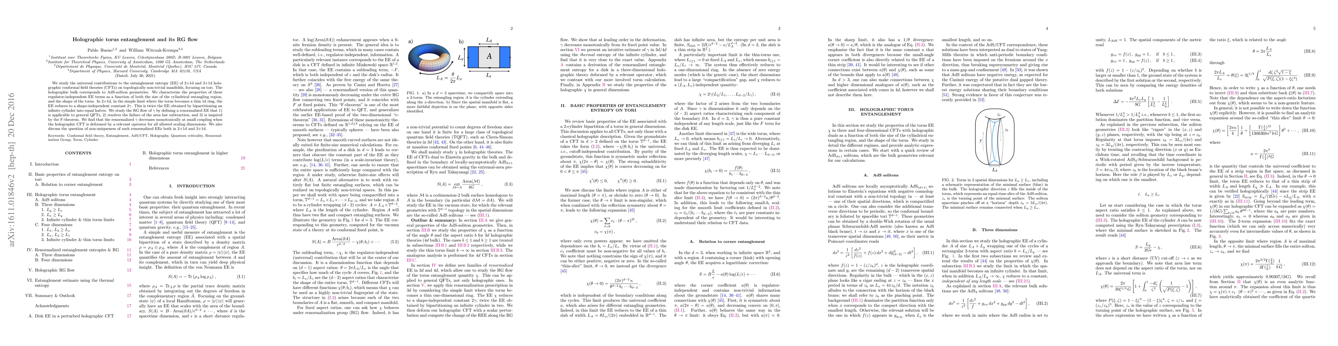 We study the universal contributions to the entanglement entropy (EE) of 2+1d and 3+1d holographic conformal field theories (CFTs) on topologically non-trivial manifolds, focusing on tori. The holographic bulk corresponds to AdS-soliton geometries. We characterize the properties of these regulator-independent EE terms as a function of both the size of the cylindrical entangling region, and the shape of the torus. In 2+1d, in the simple limit where the torus becomes a thin 1d ring, the EE reduces to a shape-independent constant $2\gamma$. This is twice the EE obtained by bipartitioning an infinite cylinder into equal halves. We study the RG flow of $\gamma$ by defining a renormalized EE that 1) is applicable to general QFTs, 2) resolves the failure of the area law subtraction, and 3) is inspired by the F-theorem. We find that the renormalized $\gamma$ decreases monotonically when the holographic CFT is deformed by a relevant operator for all allowed scaling dimensions. We also discuss the question of non-uniqueness of such renormalized EEs both in 2+1d and 3+1d.