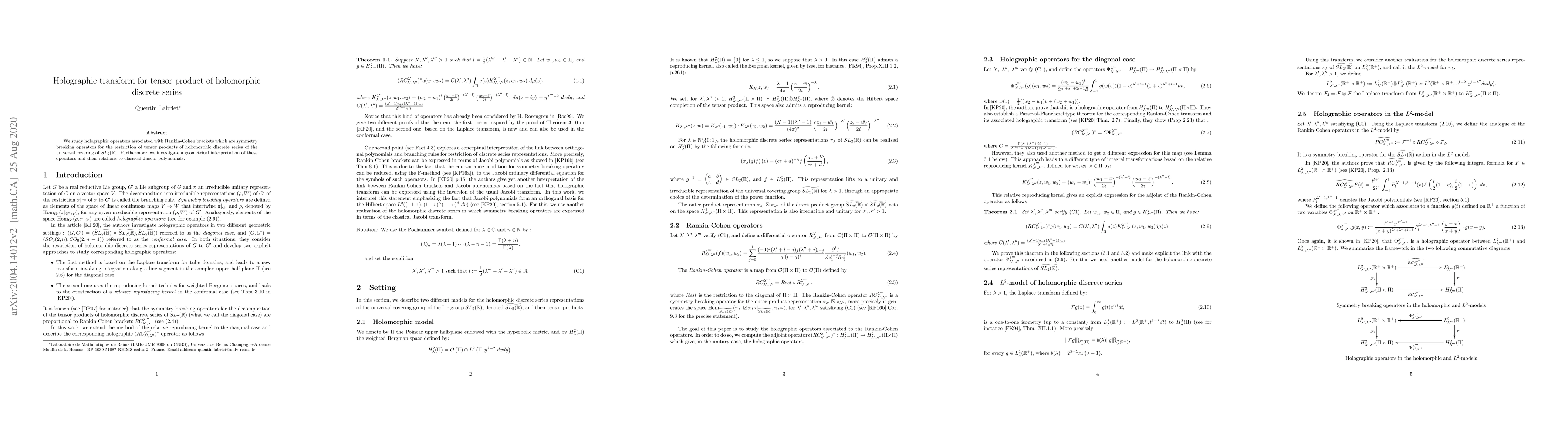 This paper explores holographic operators linked to Rankin-Cohen brackets, which act as symmetry breaking operators for tensor products of holomorphic discrete series in SL2(R). It also investigates the geometrical meaning of these operators and their connections to classical Jacobi polynomials.
