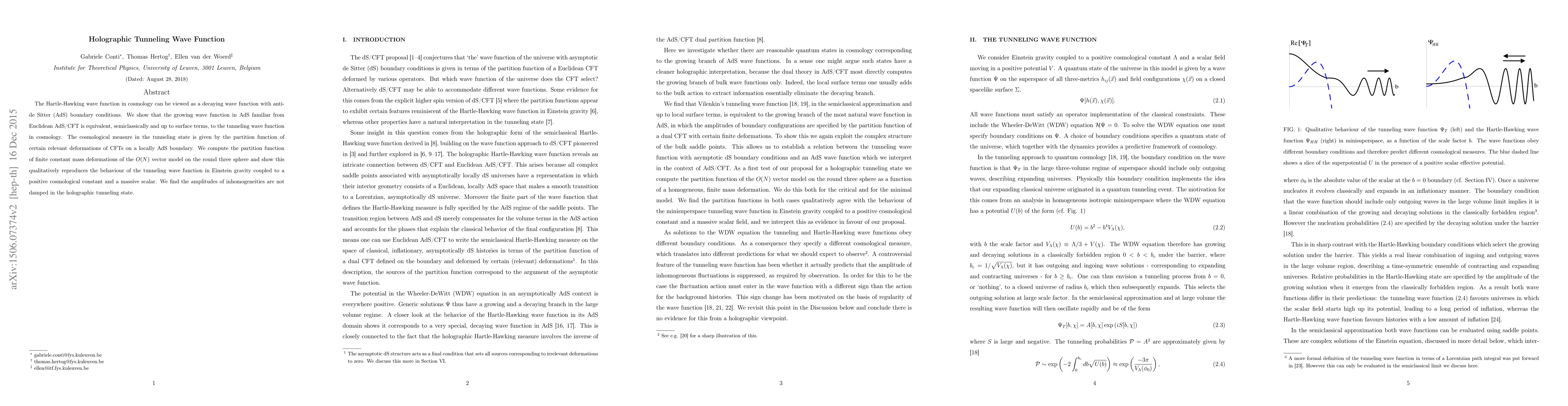 This paper demonstrates the equivalence between the Hartle-Hawking wave function in cosmology and the growing wave function in AdS, showing they match semiclassically in tunneling scenarios. It computes the partition function for O(N) vector model deformations, revealing that inhomogeneities' amplitudes remain undamped in the holographic tunneling state.