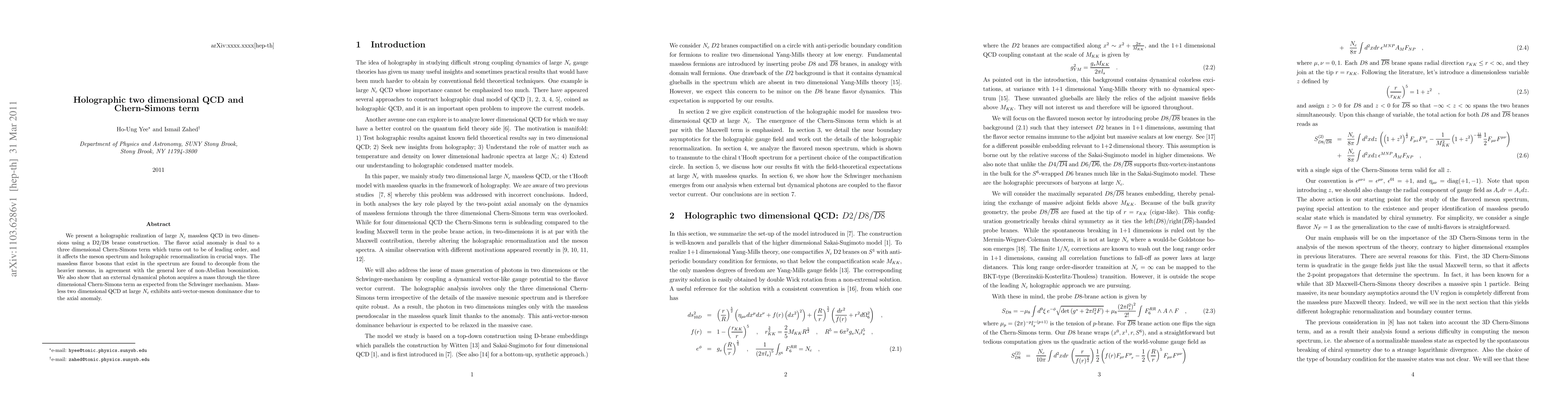 This paper explores a holographic model of large Nc massless two-dimensional QCD using D2/D8 brane construction, revealing that the flavor axial anomaly corresponds to a leading three-dimensional Chern-Simons term, influencing the meson spectrum and holographic renormalization. The study also demonstrates anti-vector-meson dominance and photon mass acquisition via the Chern-Simons term.