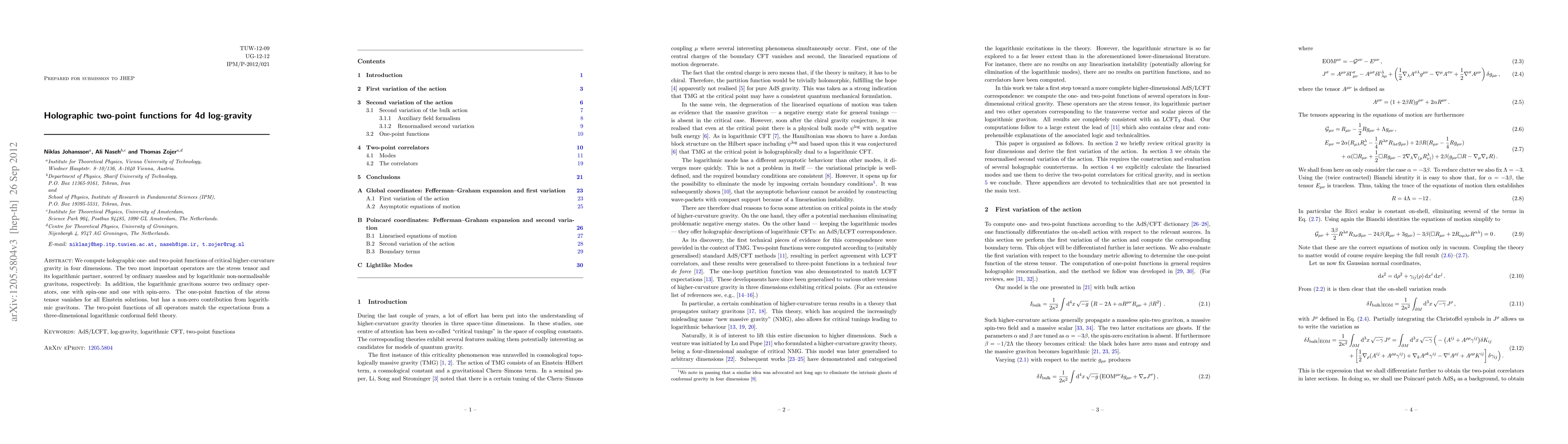 This paper computes holographic one- and two-point functions for critical higher-curvature gravity in four dimensions, focusing on the stress tensor and its logarithmic partner. The results align with expectations from a three-dimensional logarithmic conformal field theory.