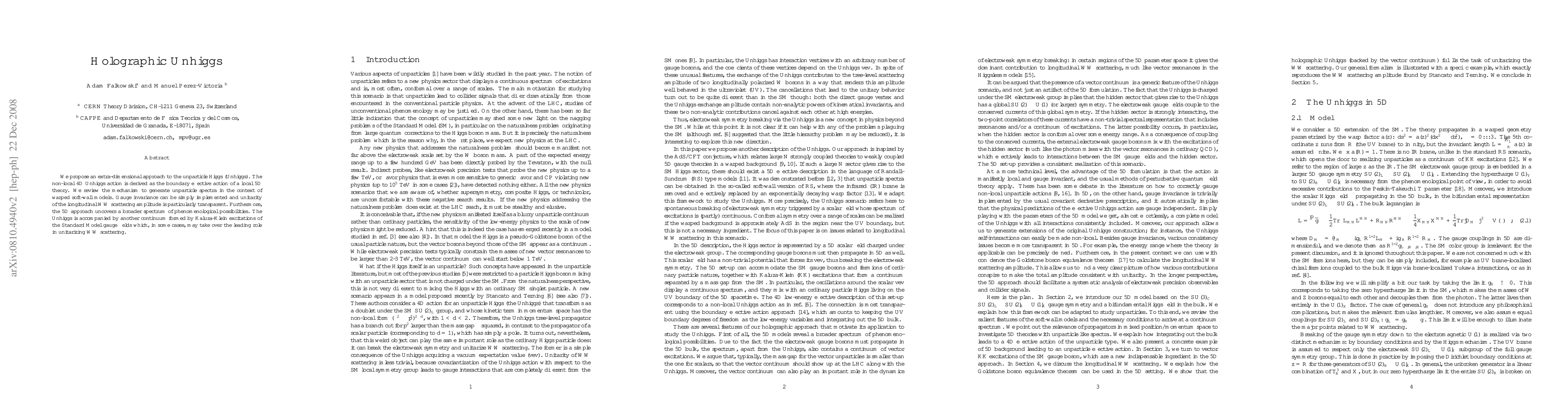 We propose an extra-dimensional approach to the unparticle Higgs (Unhiggs). The non-local 4D Unhiggs action is derived as the boundary effective action of a local 5D theory. We review the mechanism to generate unparticle spectra in the context of warped soft-wall models. Gauge invariance can be simply implemented and unitarity of the longitudinal WW scattering amplitude is particularly transparent. Furthermore, the 5D approach uncovers a broader spectrum of phenomenological possibilities. The Unhiggs is accompanied by another continuum formed by Kaluza-Klein excitations of the Standard Model gauge fields which, in some cases, may take over the leading role in unitarizing WW scattering.