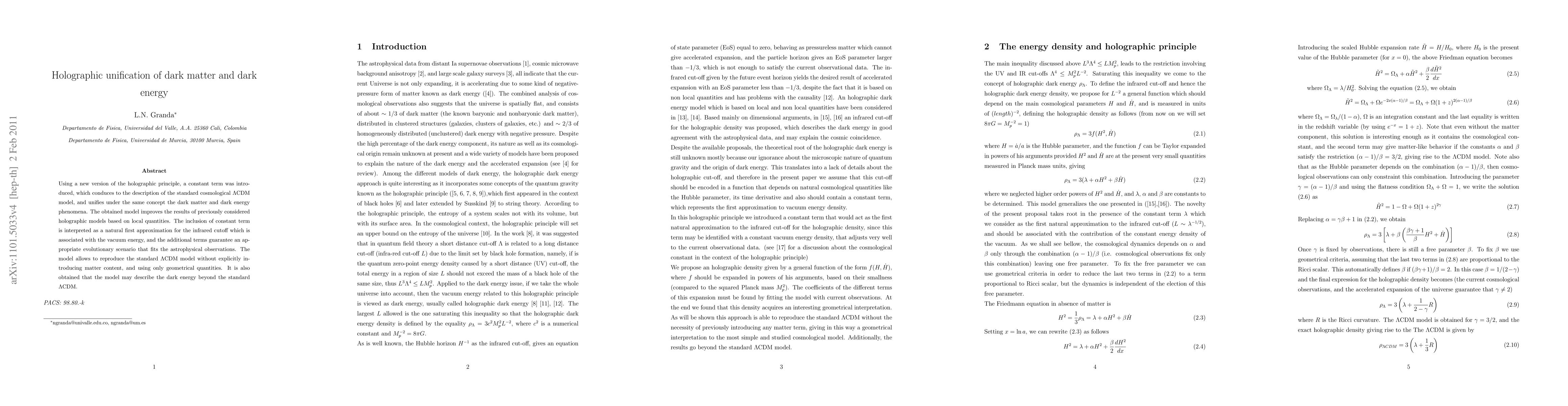 This paper proposes a new holographic principle that unifies dark matter and dark energy using a constant term, improving upon previous models based on local quantities. The model reproduces the standard LCDM cosmological model without explicit matter content, relying solely on geometrical quantities, and may also describe dark energy beyond the standard model.