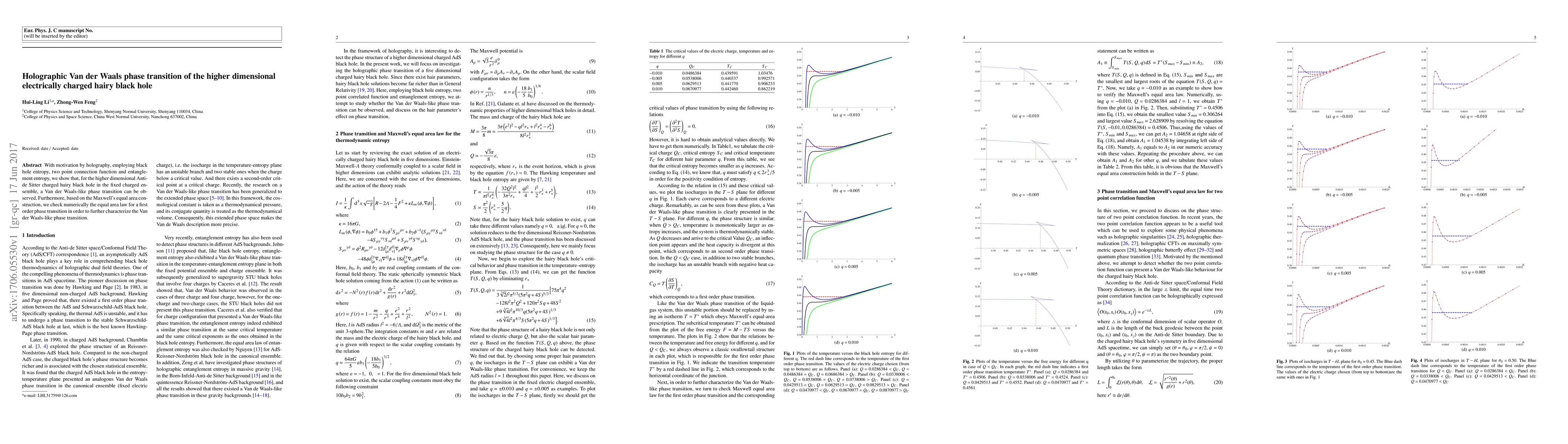 With motivation by holography, employing black hole entropy, two point connection function and entanglement entropy, we show that, for the higher dimensional Anti-de Sitter charged hairy black hole in the fixed charged ensemble, a Van der Waals-like phase transition can be observed. Furthermore, based on the Maxwell's equal area construction, we check numerically the equal area law for a first order phase transition in order to further characterize the Van der Waals-like phase transition.
