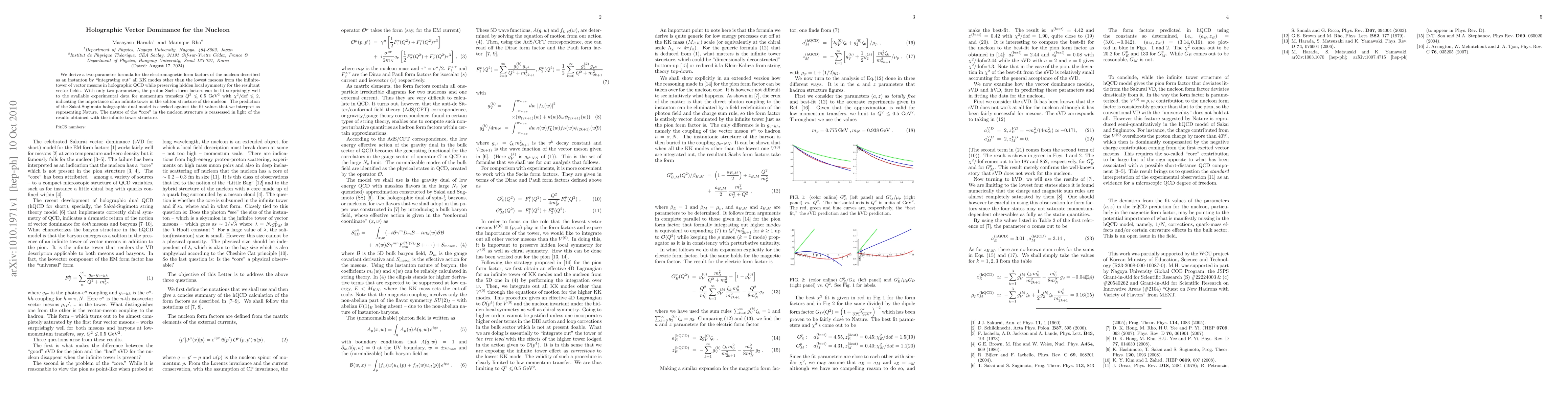 We derive a two-parameter formula for the electromagnetic form factors of the nucleon described as an instanton by "integrating out" all KK modes other than the lowest mesons from the infinite-tower of vector mesons in holographic QCD while preserving hidden local symmetry for the resultant vector fields. With only two parameters, the proton Sachs form factors can be fit surprisingly well to the available experimental data for momentum transfers $Q^2\lsim 0.5$ GeV$^2$ with $\chi^2$/dof $\lsim 2$, indicating the importance of an infinite tower in the soliton structure of the nucleon. The prediction of the Sakai-Sugimoto holographic dual model is checked against the fit values that we interpret as representing Nature. The nature of the "core" in the nucleon structure is reassessed in light of the results obtained with the infinite-tower structure.