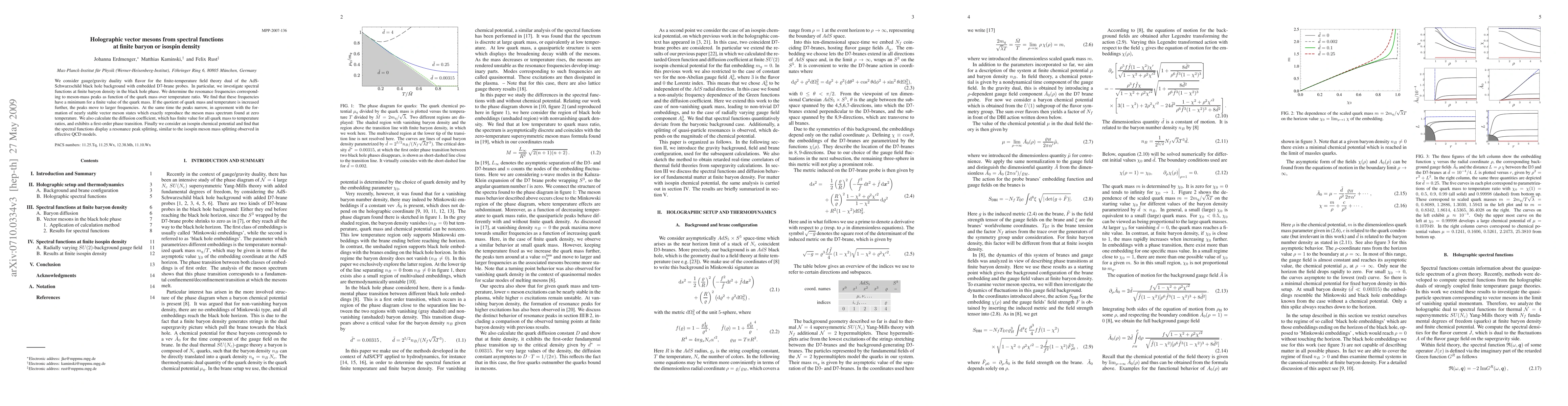 Researchers used gauge/gravity duality to study vector meson formation at finite temperature and baryon density, finding that the resonance frequencies decrease with increasing quark mass but narrow as temperature increases.