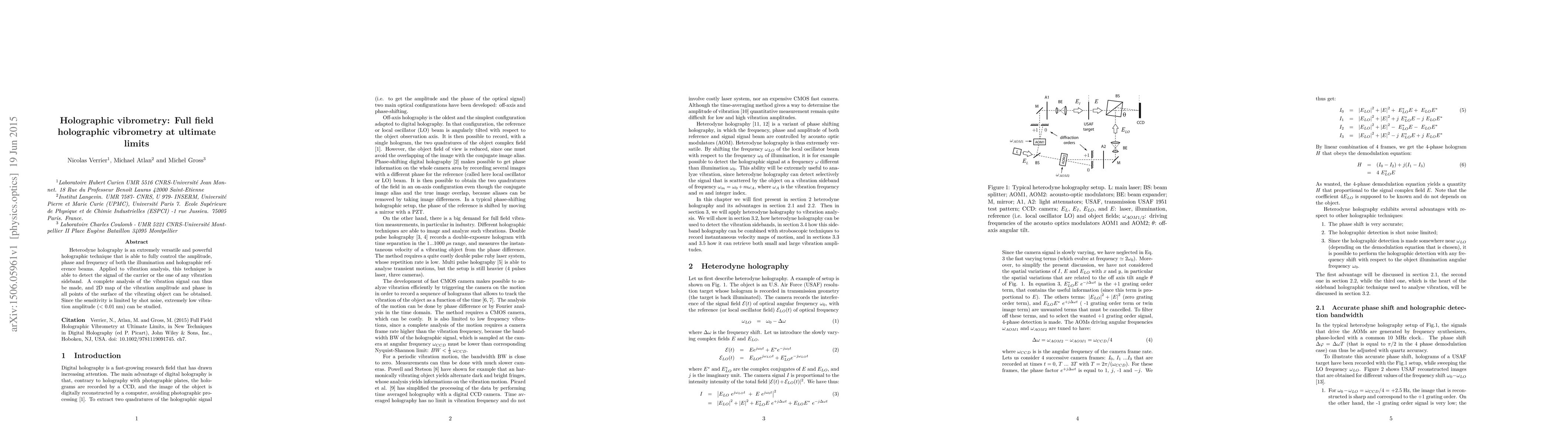 Heterodyne holography is an extremely versatile and powerful holographic technique that is able to fully control the amplitude, phase and frequency of both the illumination and holographic reference beams. Applied to vibration analysis, this technique is able to detect the signal of the carrier or the one of any vibration sideband. A complete analysis of the vibration signal can thus be made, and 2D map of the vibration amplitude and phase in all points of the surface of the vibrating object can be obtained. Since the sensitivity is limited by shot noise, extremely low vibration amplitude (\textless{} 0.01 nm) can be studied.