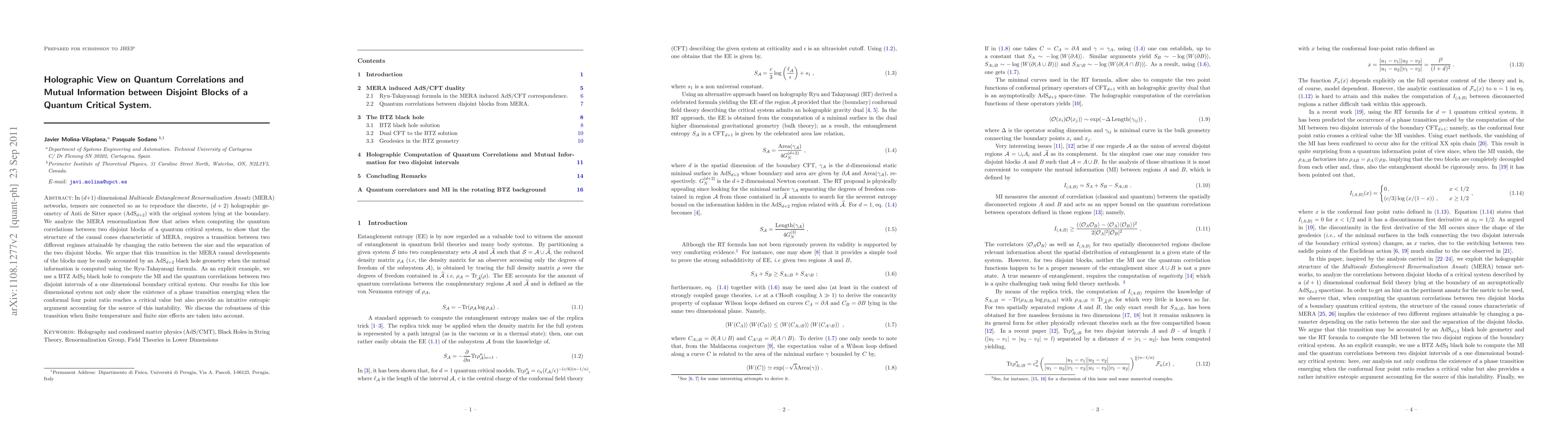 In (d+1) dimensional Multiscale Entanglement Renormalization Ansatz (MERA) networks, tensors are connected so as to reproduce the discrete, (d + 2) holographic geometry of Anti de Sitter space (AdSd+2) with the original system lying at the boundary. We analyze the MERA renormalization flow that arises when computing the quantum correlations between two disjoint blocks of a quantum critical system, to show that the structure of the causal cones characteristic of MERA, requires a transition between two different regimes attainable by changing the ratio between the size and the separation of the two disjoint blocks. We argue that this transition in the MERA causal developments of the blocks may be easily accounted by an AdSd+2 black hole geometry when the mutual information is computed using the Ryu-Takayanagi formula. As an explicit example, we use a BTZ AdS3 black hole to compute the MI and the quantum correlations between two disjoint intervals of a one dimensional boundary critical system. Our results for this low dimensional system not only show the existence of a phase transition emerging when the conformal four point ratio reaches a critical value but also provide an intuitive entropic argument accounting for the source of this instability. We discuss the robustness of this transition when finite temperature and finite size effects are taken into account.