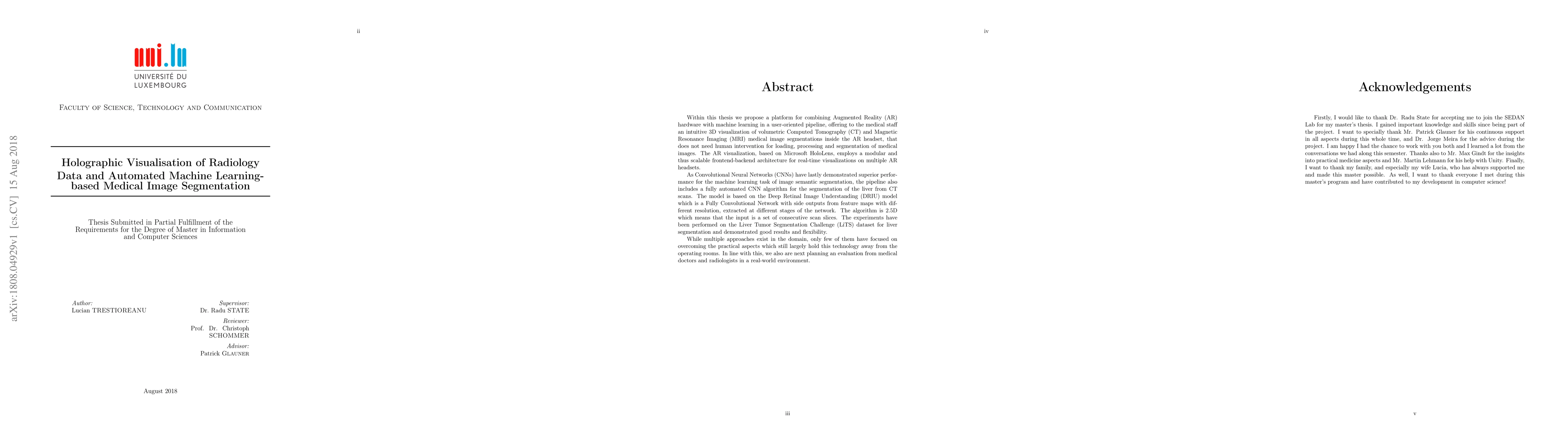 Within this thesis we propose a platform for combining Augmented Reality (AR) hardware with machine learning in a user-oriented pipeline, offering to the medical staff an intuitive 3D visualization of volumetric Computed Tomography (CT) and Magnetic Resonance Imaging (MRI) medical image segmentations inside the AR headset, that does not need human intervention for loading, processing and segmentation of medical images. The AR visualization, based on Microsoft HoloLens, employs a modular and thus scalable frontend-backend architecture for real-time visualizations on multiple AR headsets. As Convolutional Neural Networks (CNNs) have lastly demonstrated superior performance for the machine learning task of image semantic segmentation, the pipeline also includes a fully automated CNN algorithm for the segmentation of the liver from CT scans. The model is based on the Deep Retinal Image Understanding (DRIU) model which is a Fully Convolutional Network with side outputs from feature maps with different resolution, extracted at different stages of the network. The algorithm is 2.5D which means that the input is a set of consecutive scan slices. The experiments have been performed on the Liver Tumor Segmentation Challenge (LiTS) dataset for liver segmentation and demonstrated good results and flexibility. While multiple approaches exist in the domain, only few of them have focused on overcoming the practical aspects which still largely hold this technology away from the operating rooms. In line with this, we also are next planning an evaluation from medical doctors and radiologists in a real-world environment.